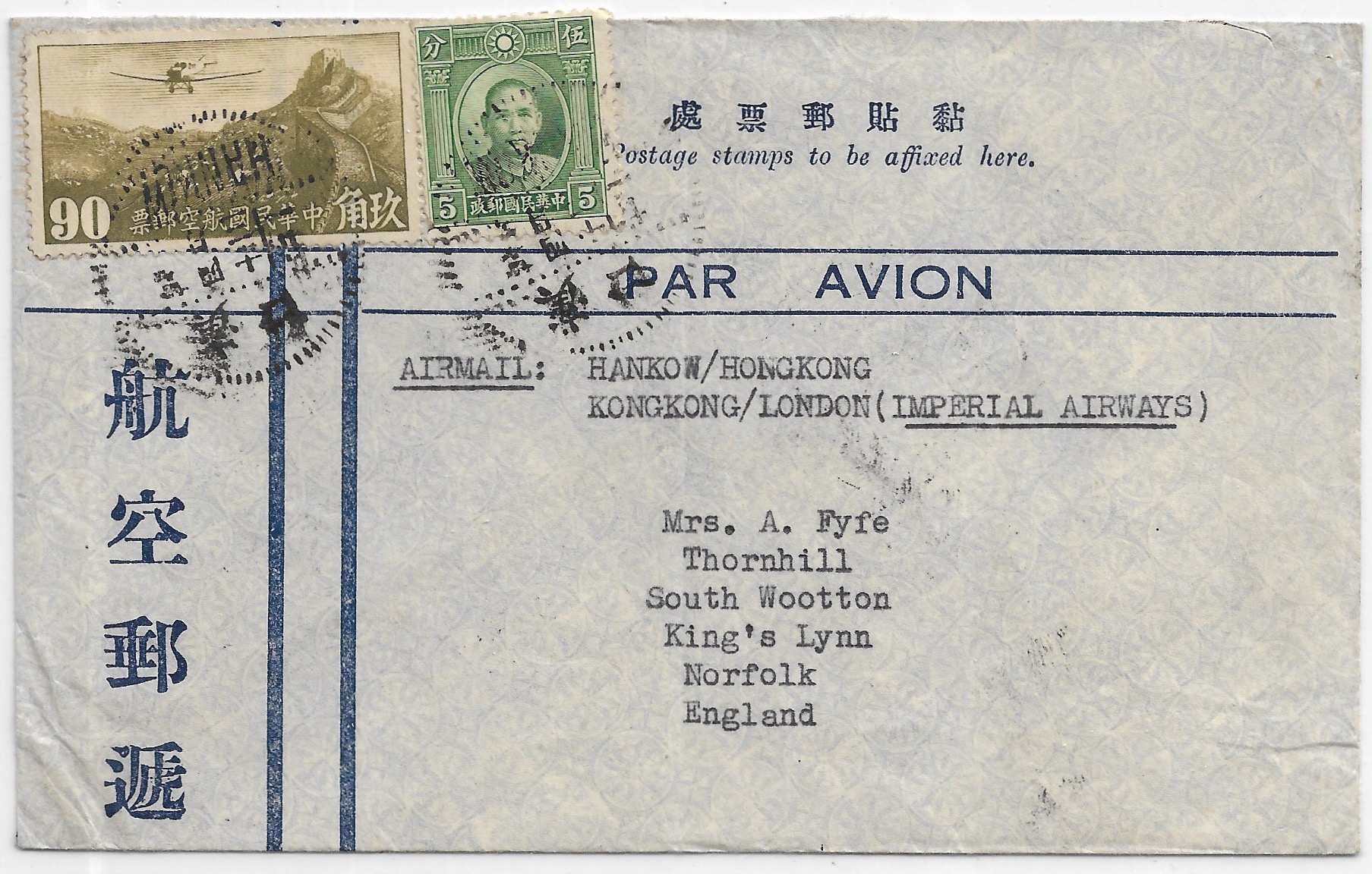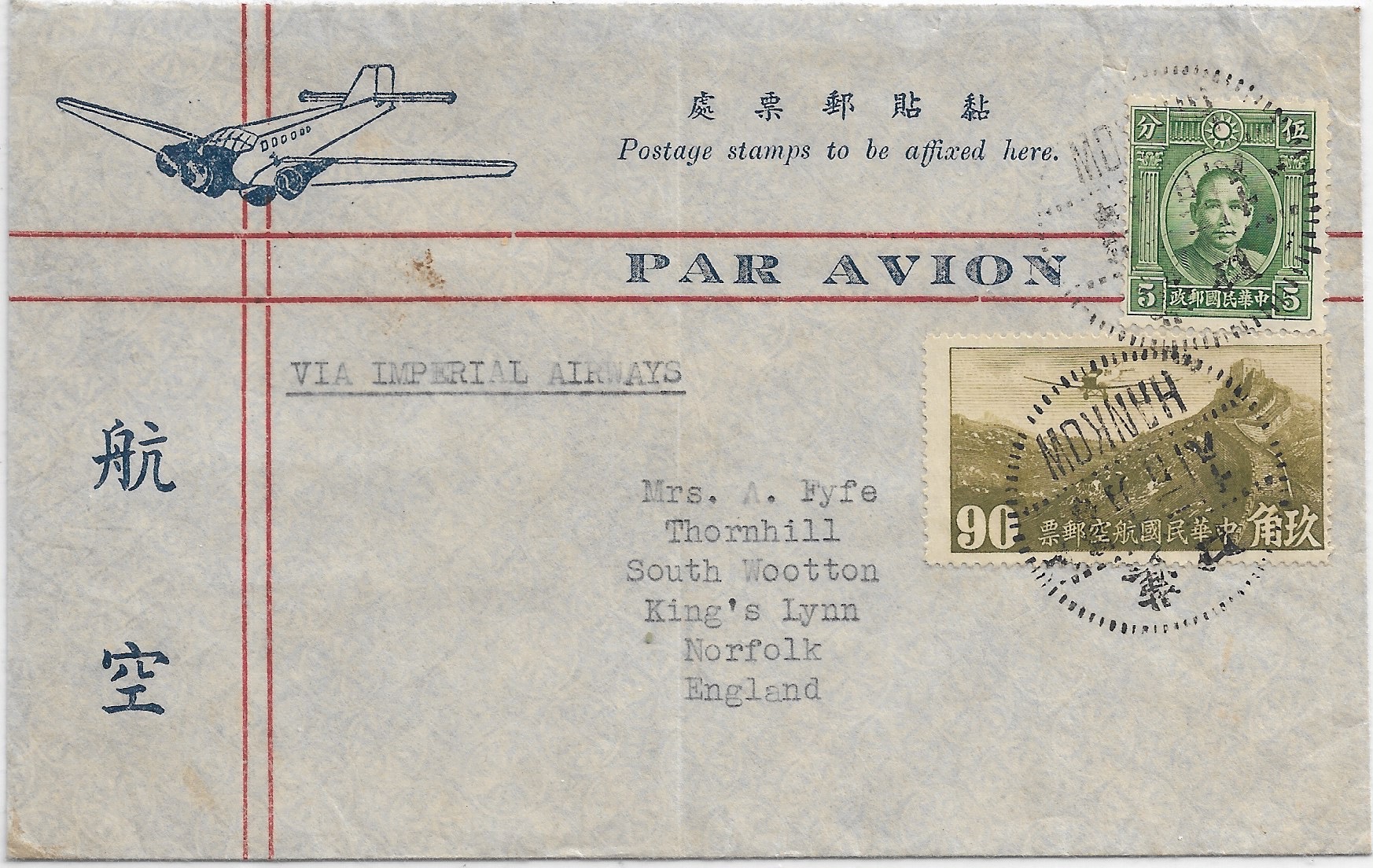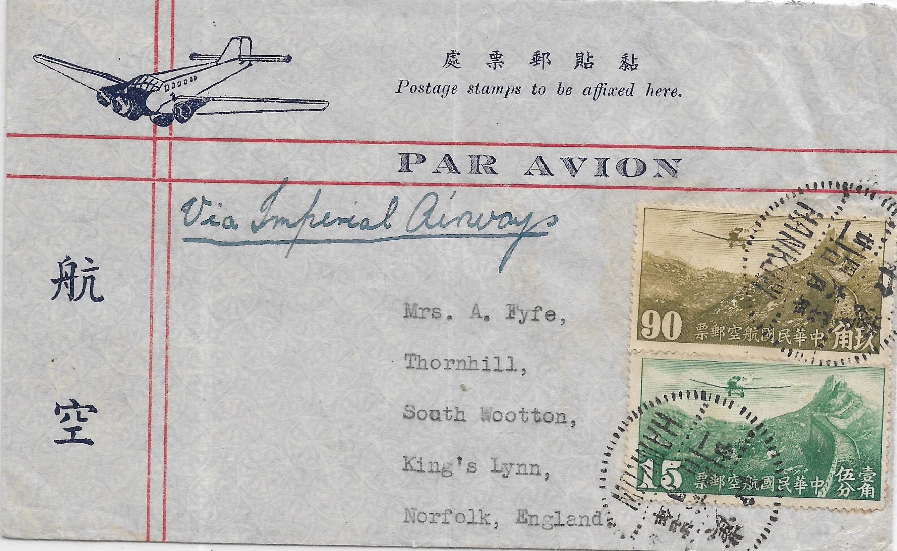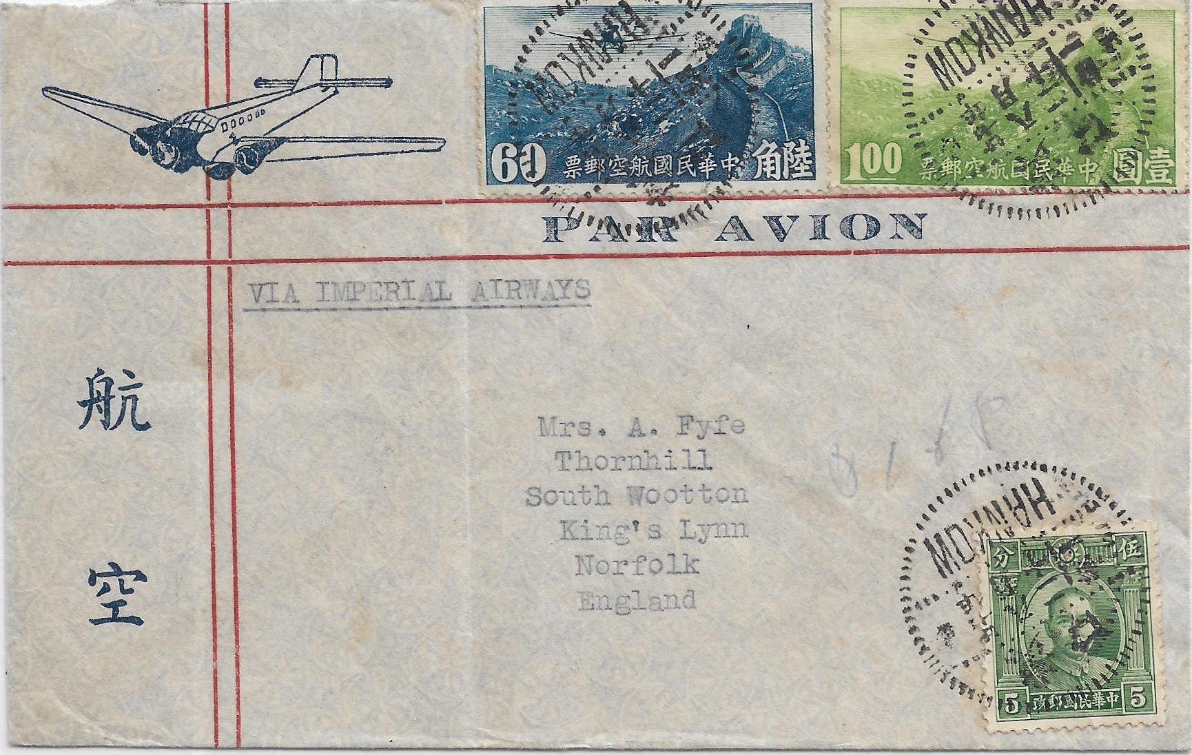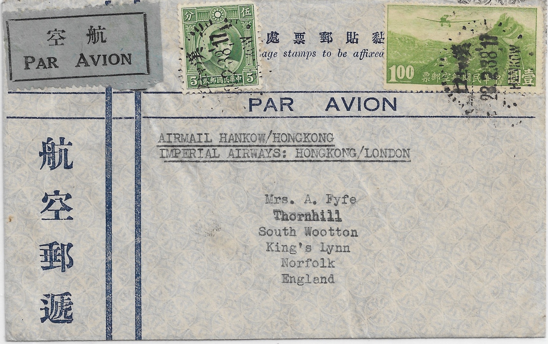 | 1938 Hankow, China to Norfolk, England Airmail. back stamped Victoria. | Price: $30.00