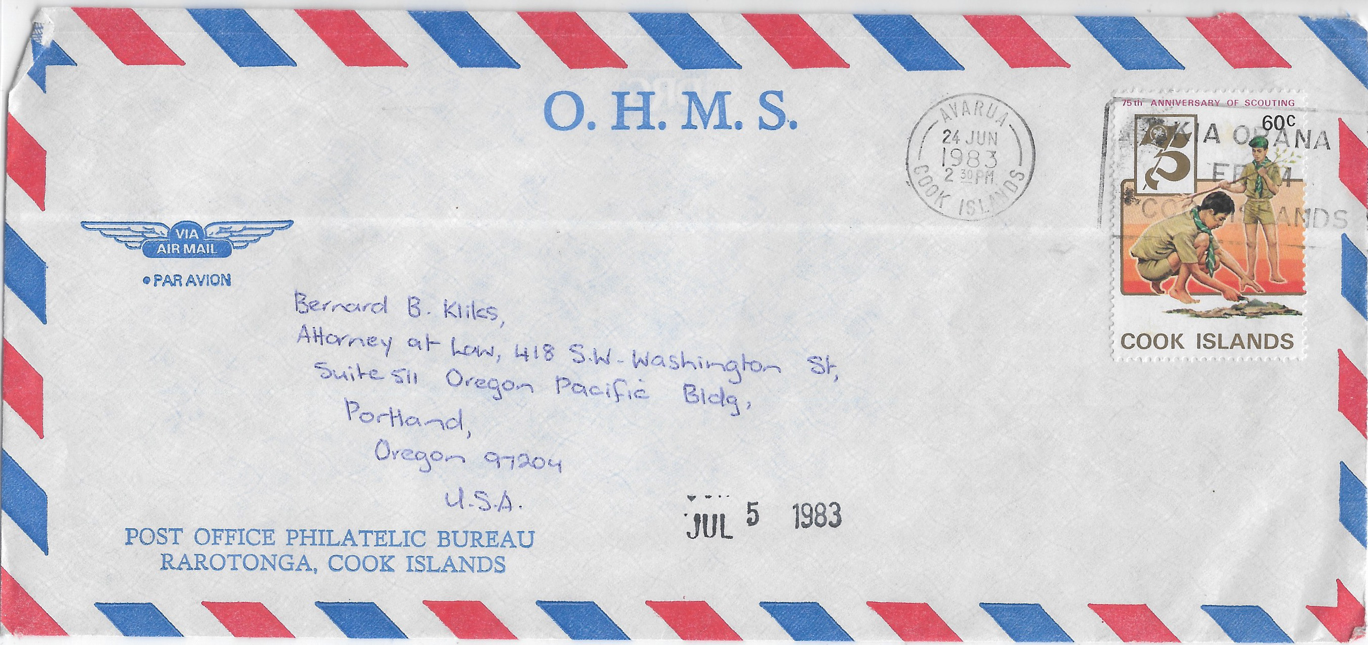 | 1983 Rarotonga, Cook Islands to Portland, Or Airmail solo Boy Scout stamp. | Price: $10.00
