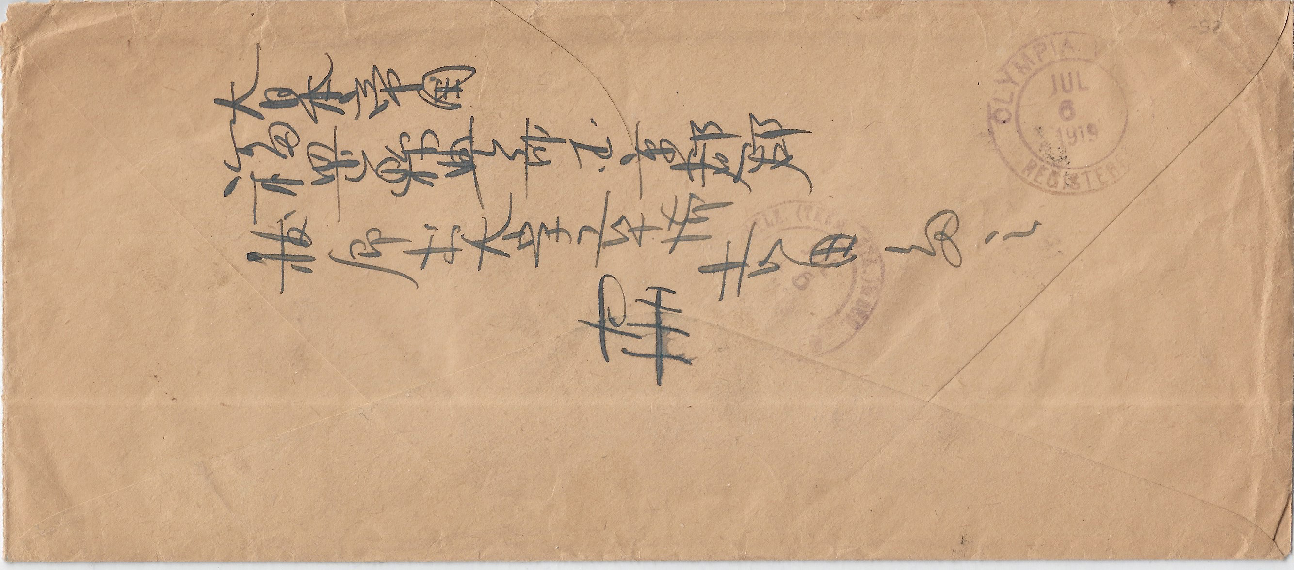 | 1919 Kobe, Japan to Olympia, Wa Registered. #10 back stamped Seattle & Olympia. | Price: $25.00
