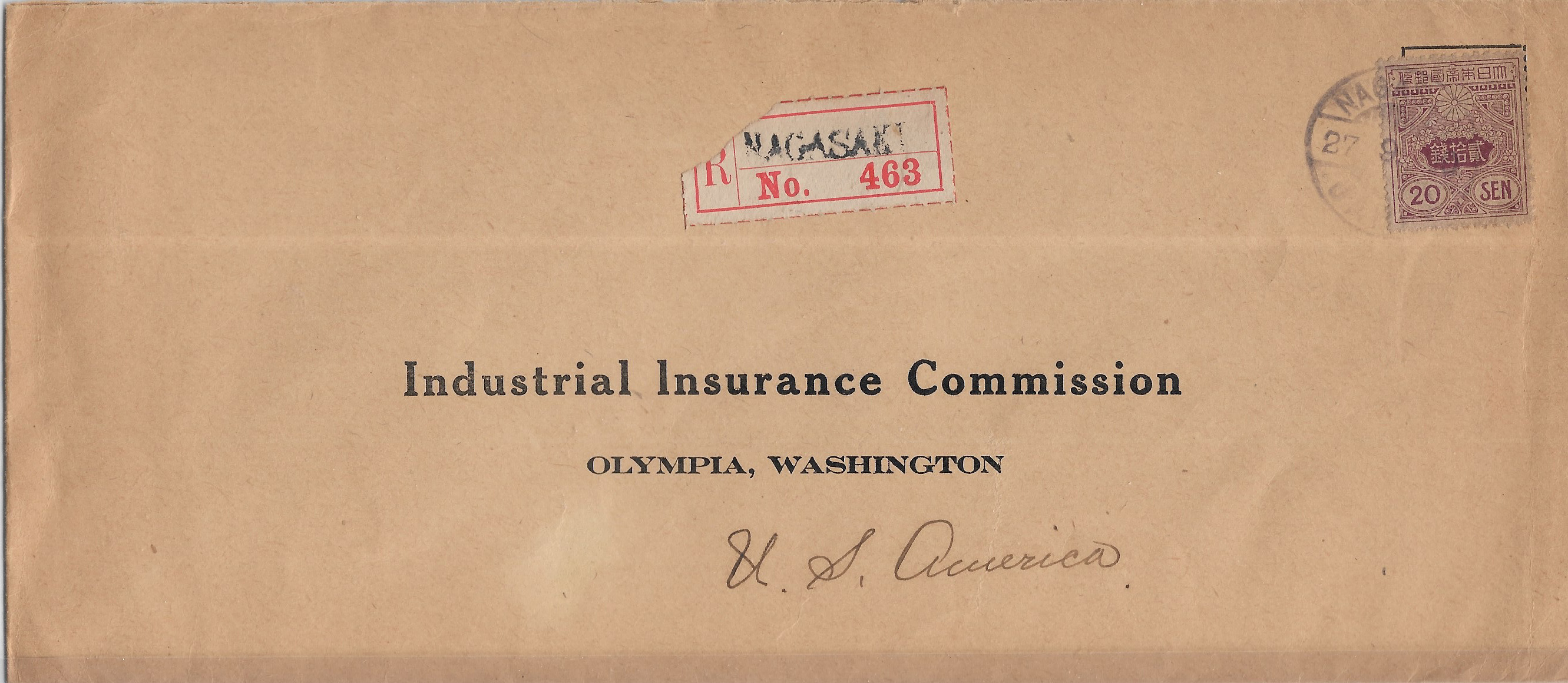 | 1920 Nagaski, Japan to Olympia, Wa Registered. #10 back stamped Seattle, Olympia. | Price: $25.00