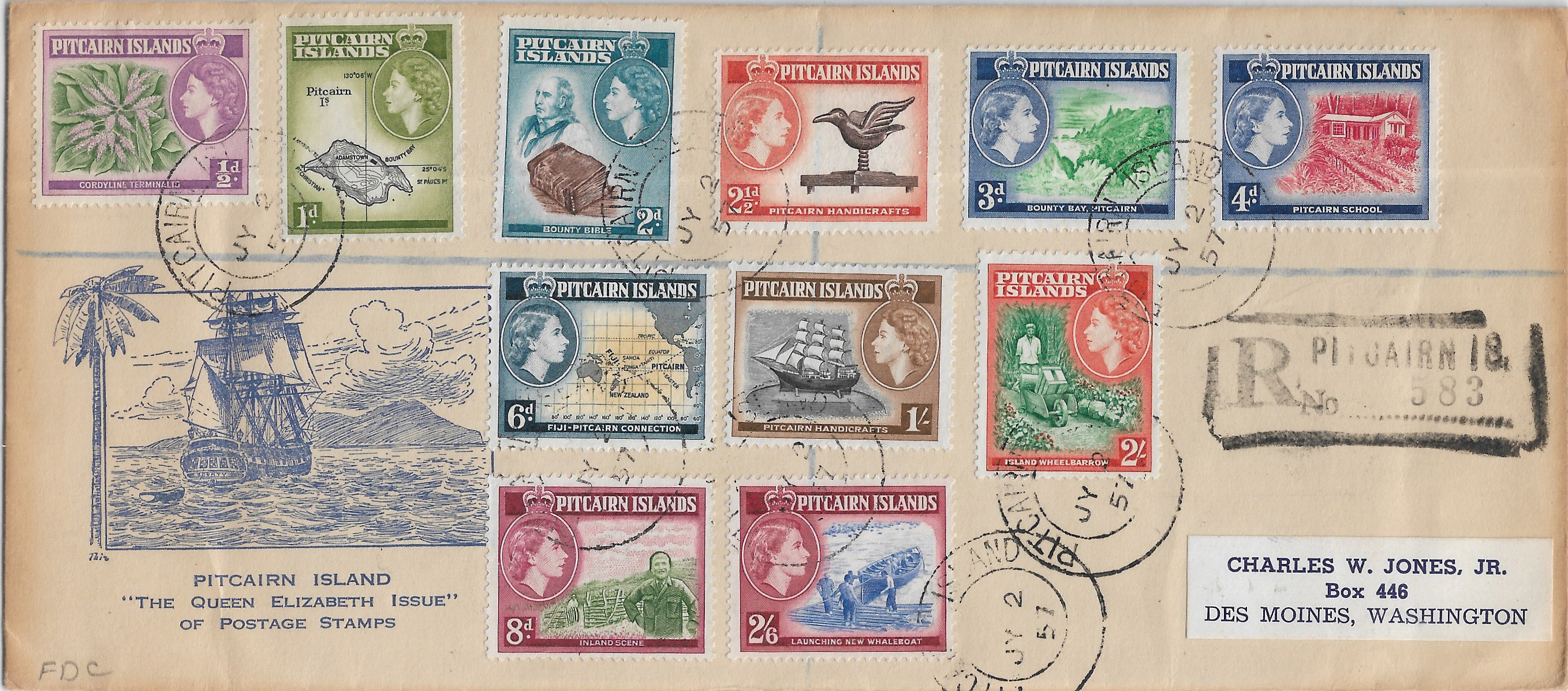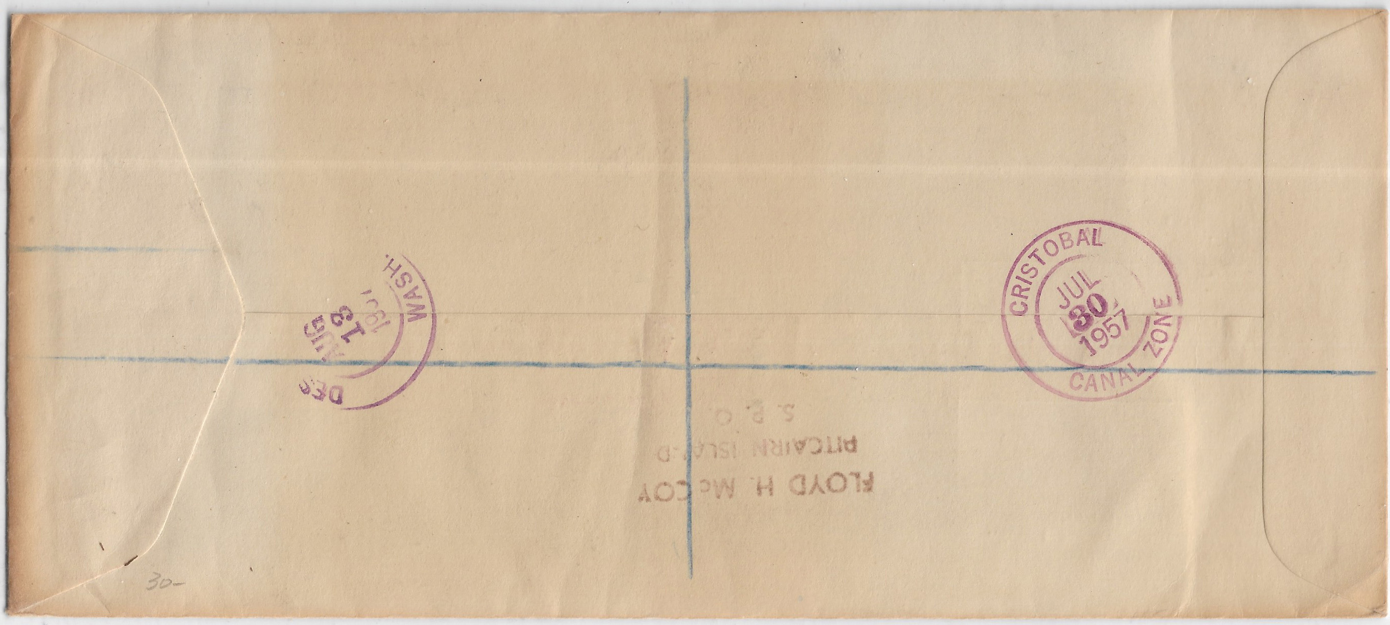| 1957 Pitcairn Island FDC to Des Moines, Wa Registered via Cristobal Canal Zone. back stamped Cristobal & Des Moines. | Price: $30.00