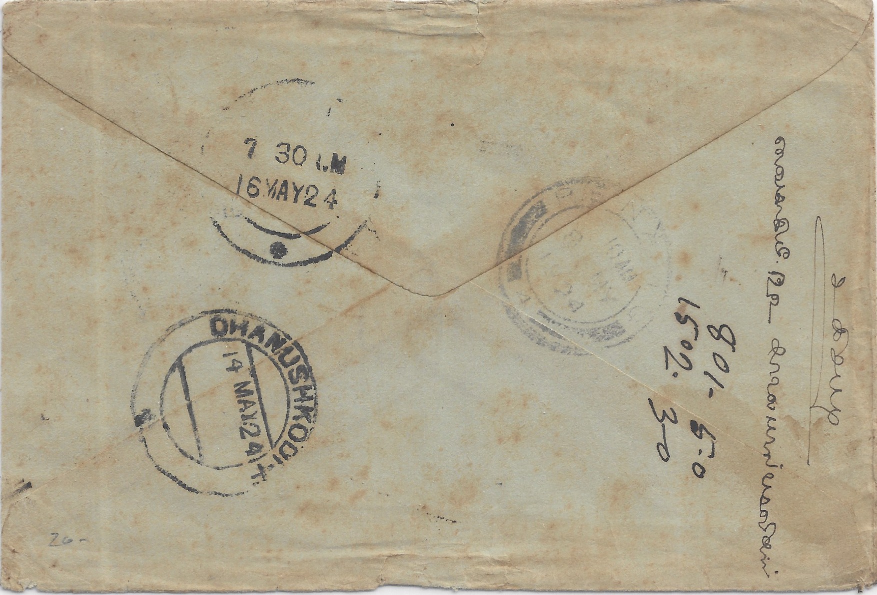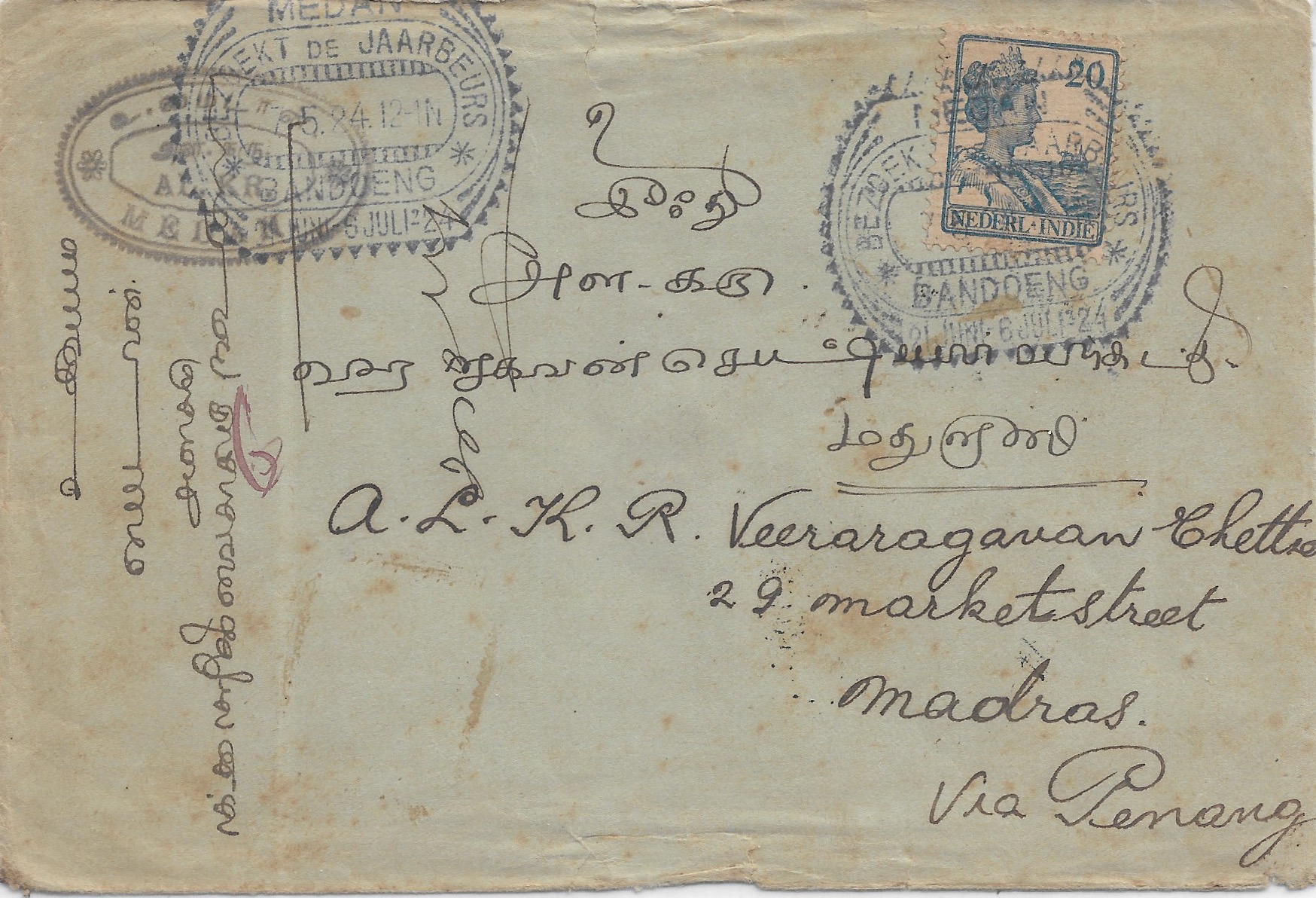 | 1924 Bandoeng, Dutch East Indies to Madras, India via Penang. back stamped Ohanushkodi & Penang. | Price: $20.00