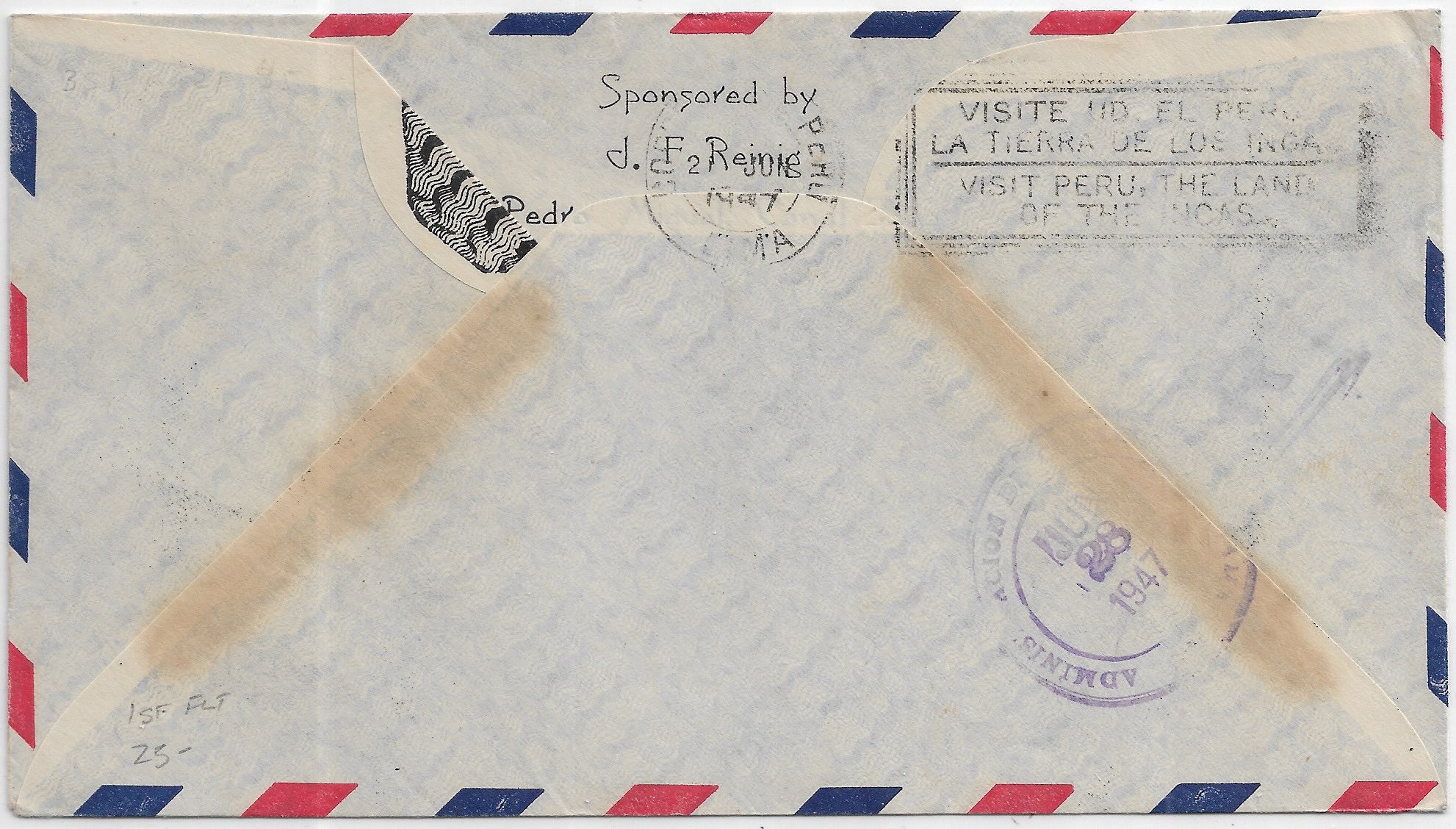 | 1947 Tocumen, Panama to Lima, Peru 1st Flight Peruvian International Airlines. back stamped Lima. | Price: $25.00