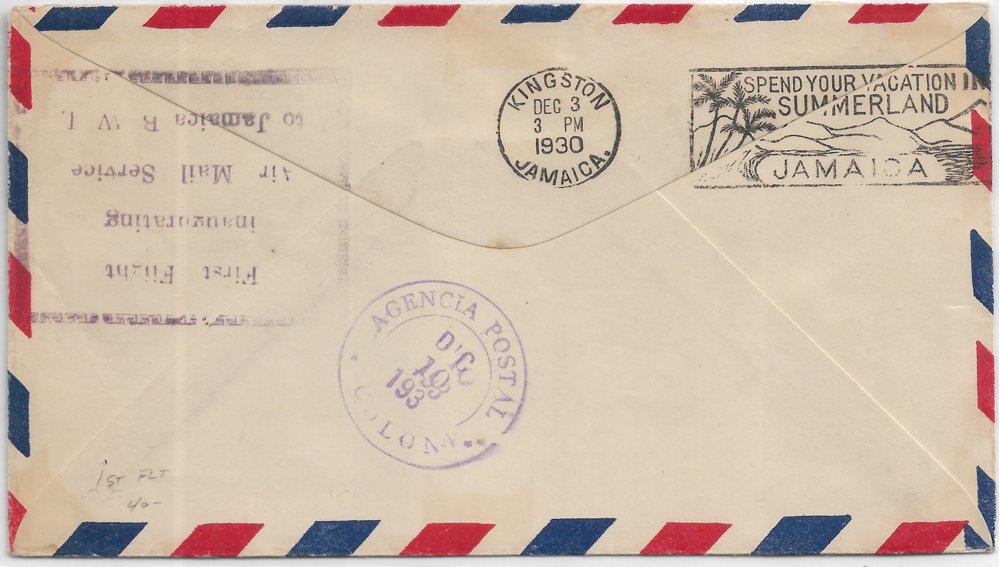 | 1930 Colon, Panama to Kingston, Jamaica 1st Flight. back stamped Colon & Kingston. | Price: $40.00