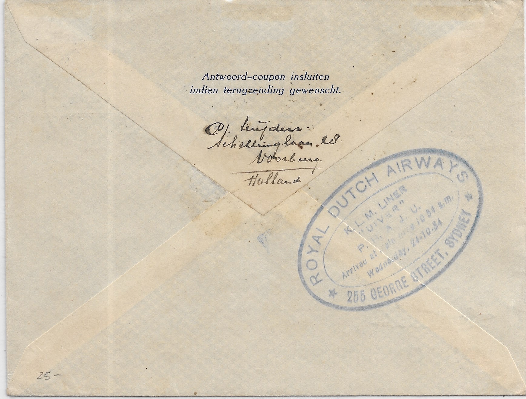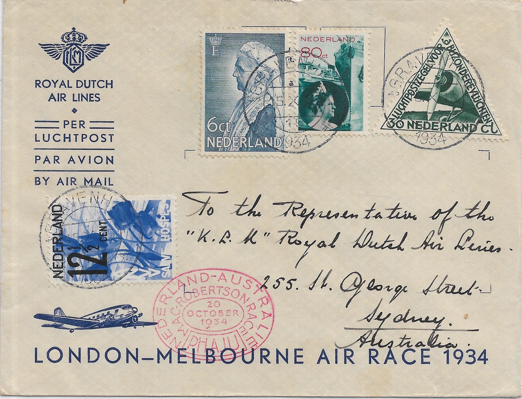 | 1934 Graven Hagen, Netherlands to Sydney, Australia, London-Melbourne Air Race. back stamped Sydney. | Price: $25.00