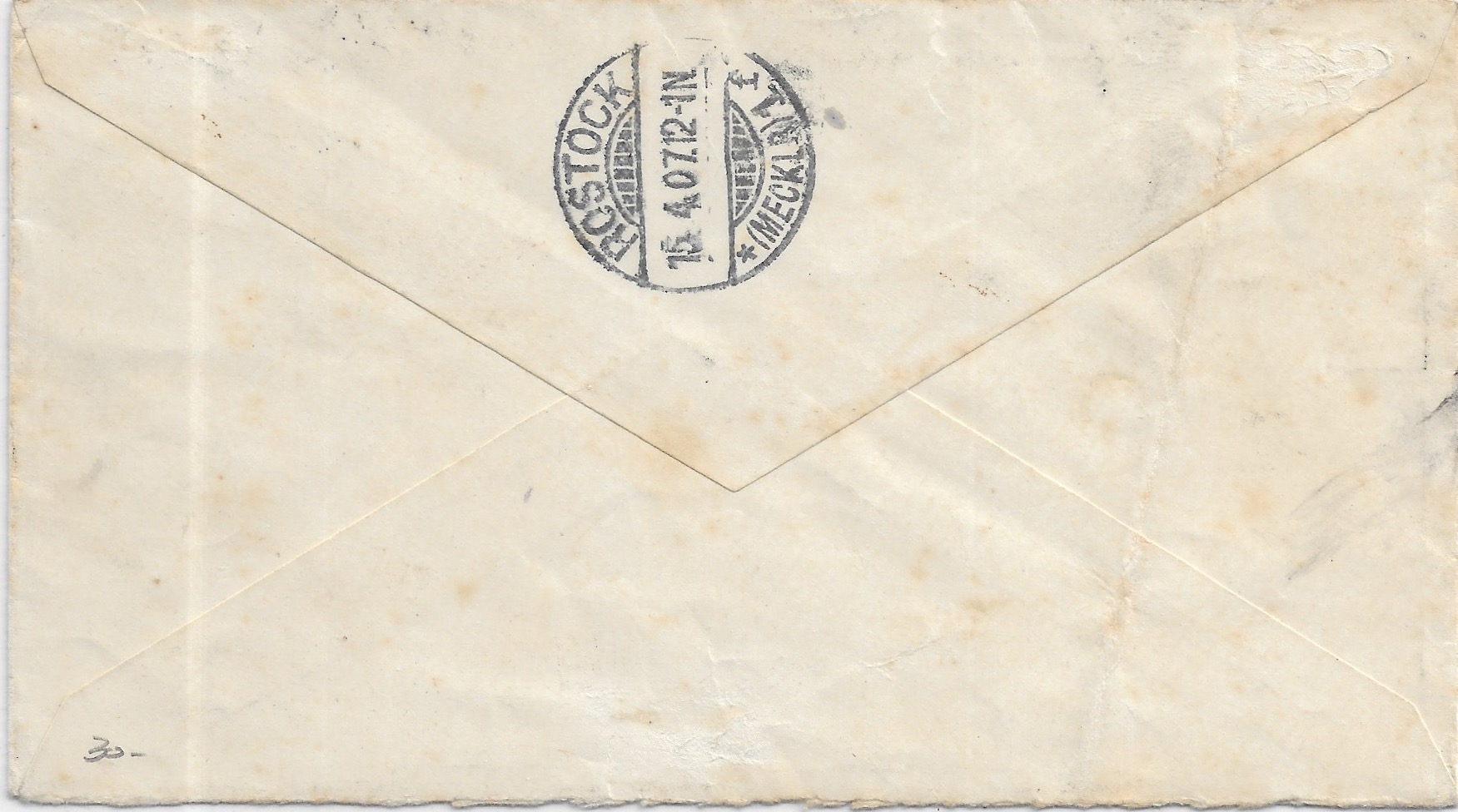 1900 German Marine Schiffspost #69 (Roland, Chartered Civilian Ship) to Warnom, Germany. back stamped Warnom.