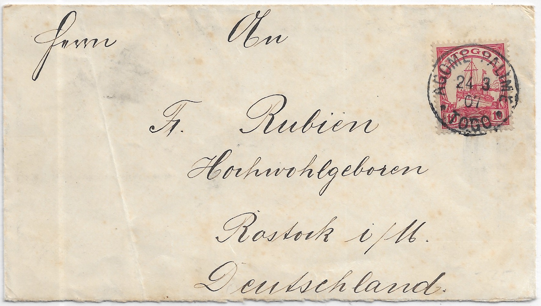 1907 Agome Palime, German Togo to Rostock, Germany. back stamped Rostock.