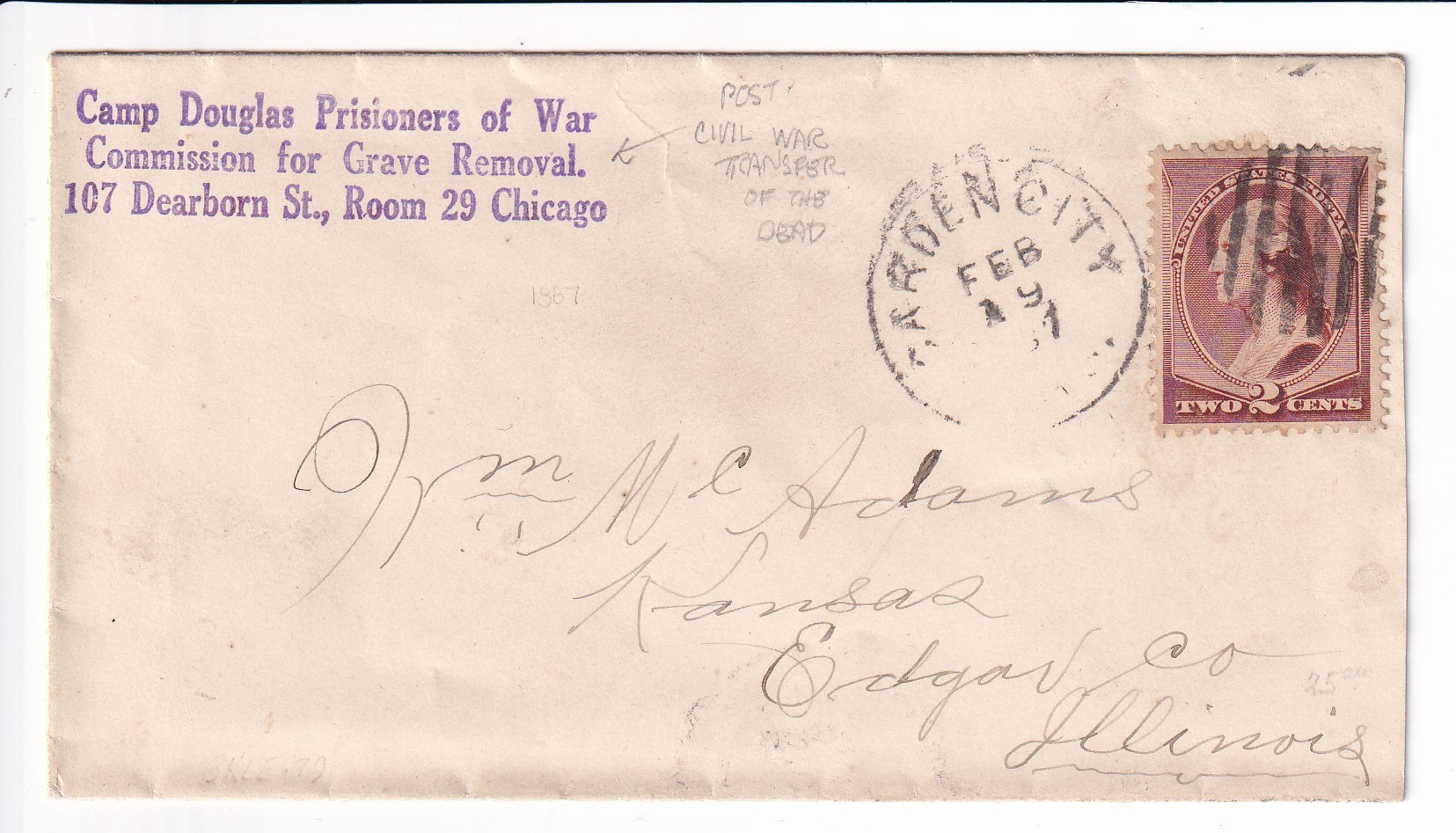 1887 Camp Douglas POW, Commission for Grave Removal, Chicago to Kansas, IL. back stamped Kansas.