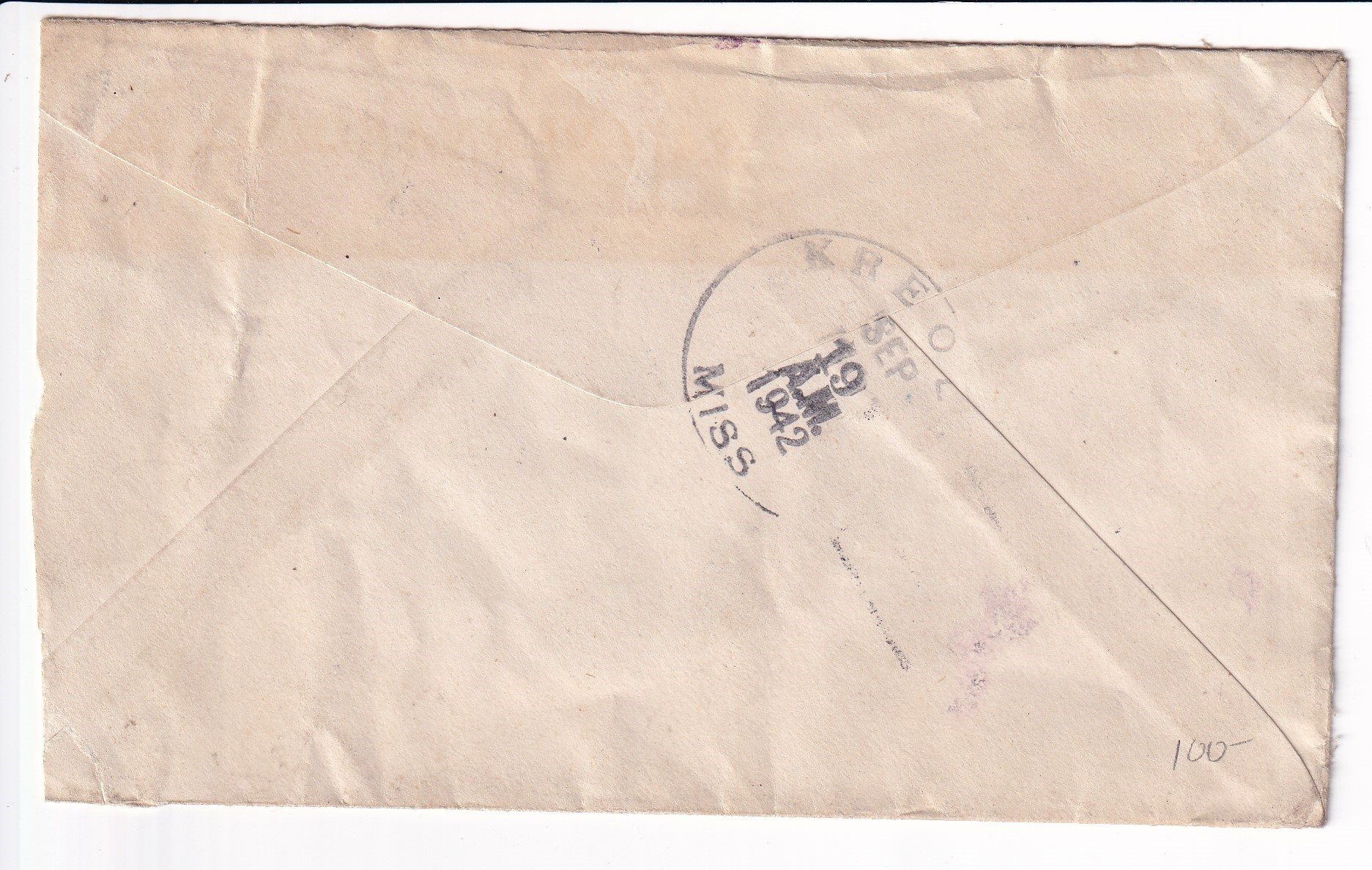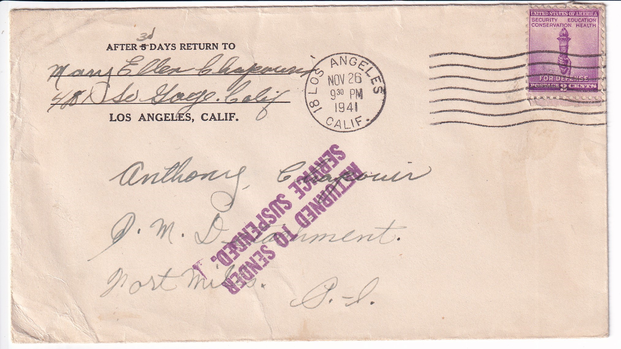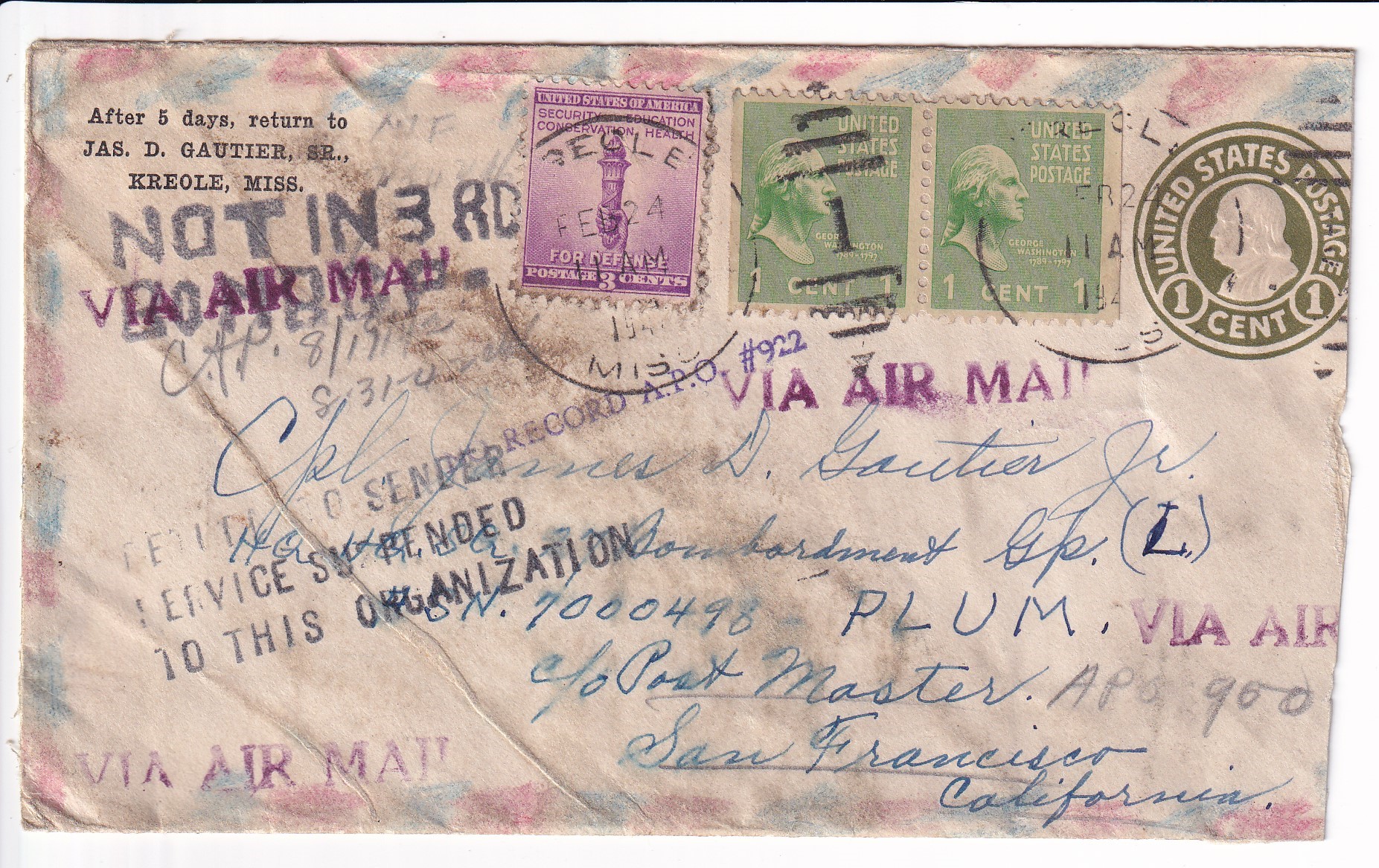 1942 Kreole, Ms to APO 900 PLUM (Philippines), RTS Service Suspended. back stamped Kreole. PLUM was the Armies code word for the Philippines.