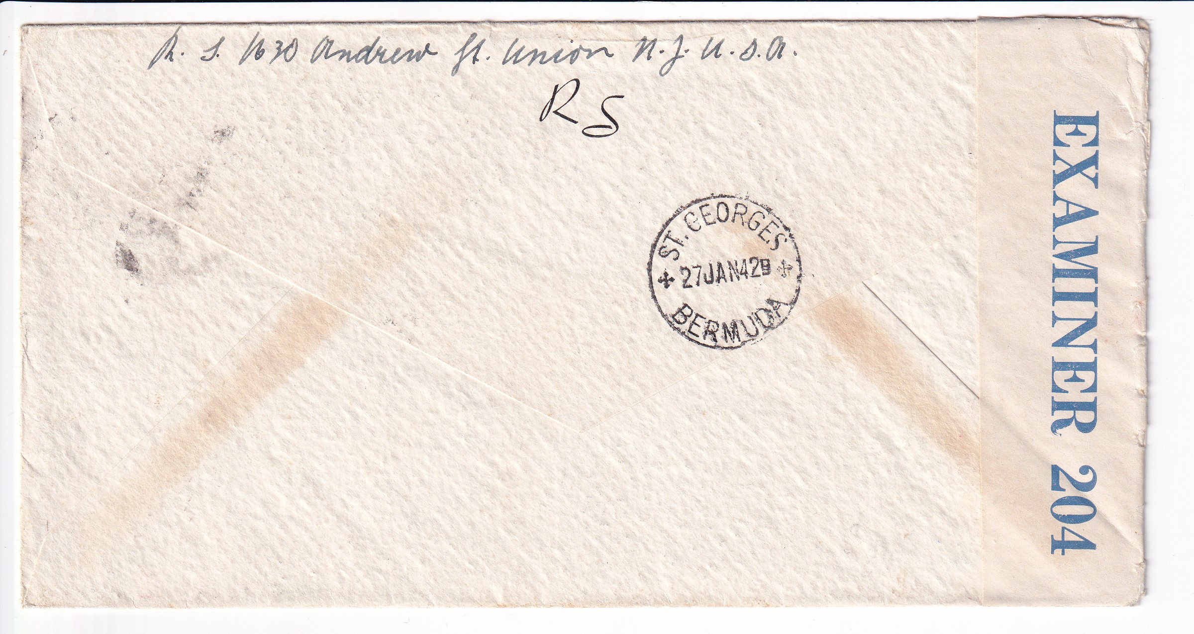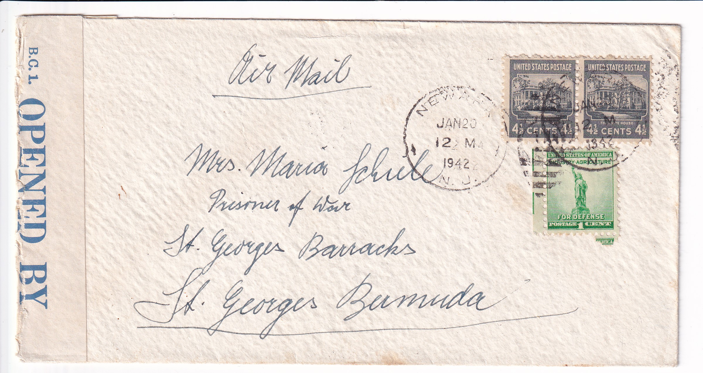 1942 Newark, NJ to St George Barracks, Bermuda, Censored 4 1/2c Prexie x 2 + 1c For Defense. St George Barracks was used as an Internment camp for Aliens in Bermuda.