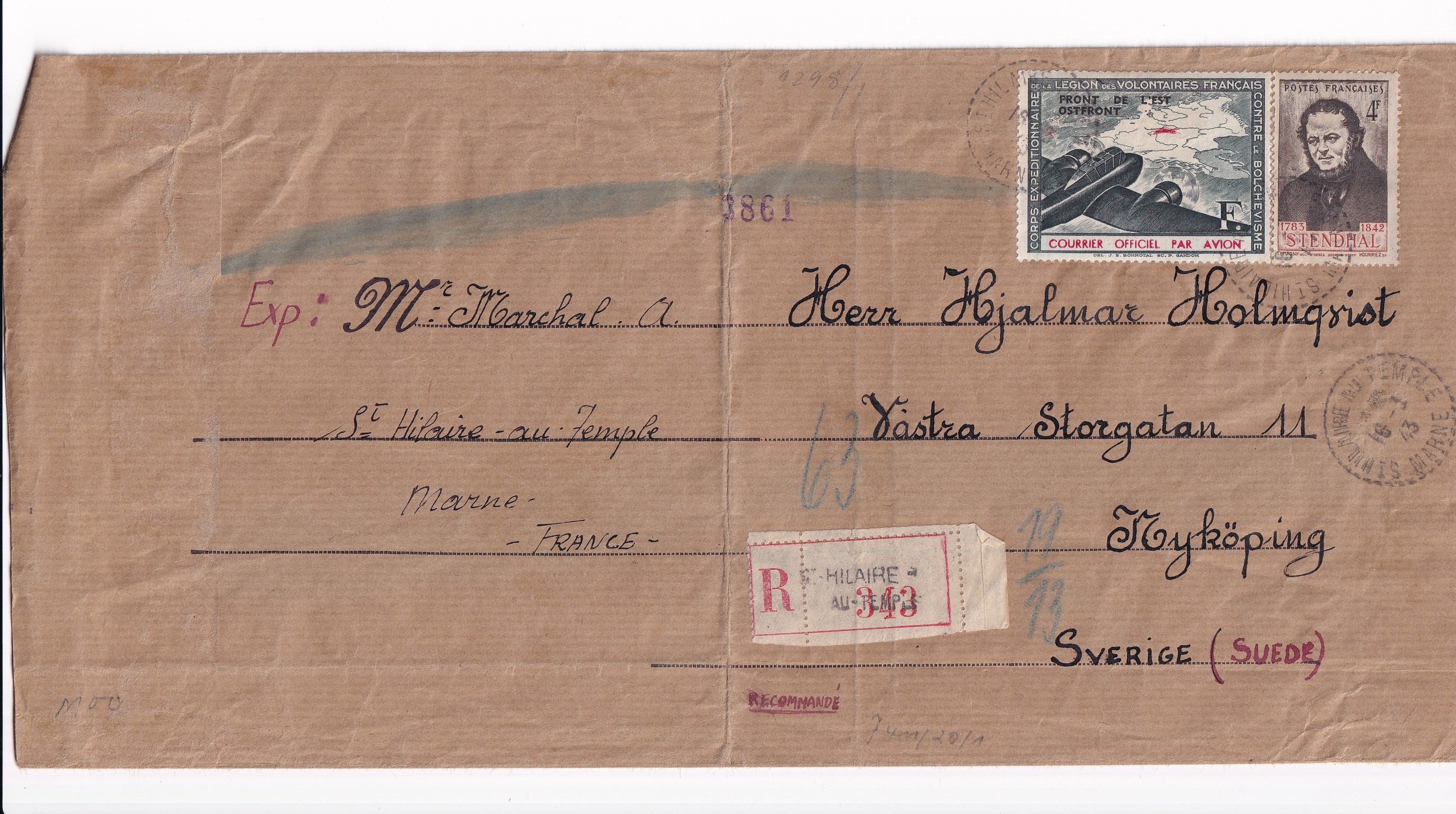 1943 French Expeditionary Corps in German Army to Sweden Registered, Berlin Censor tape. Very Rare usage on cover.