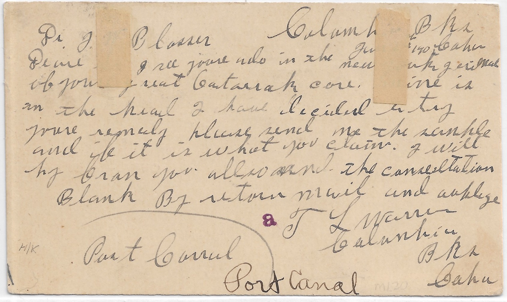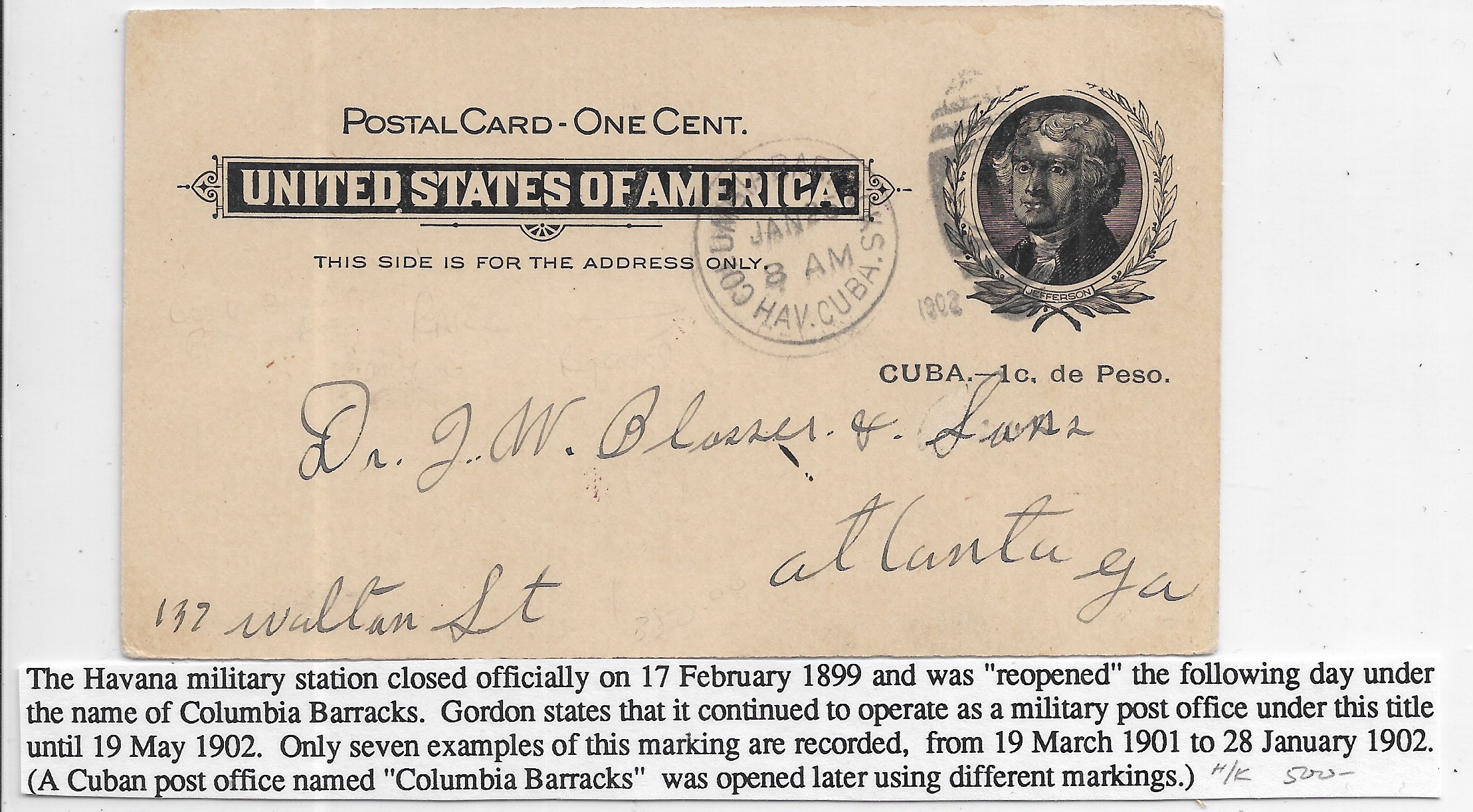 1902 Columbia Barracks, Cuba to Atlanta, Ga (only 7 examples of this marking recorded). Columbia Barracks replace the Havana Military station when it closed. Columbia Barracks was open from 19 Mar 1901 to 28 Jan 1902.