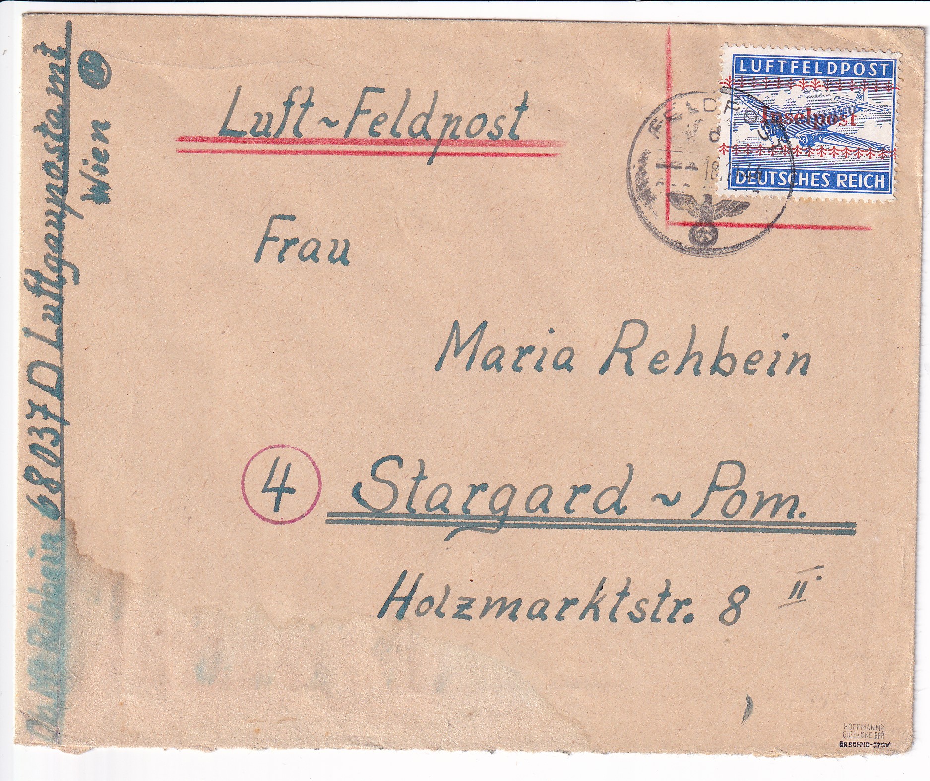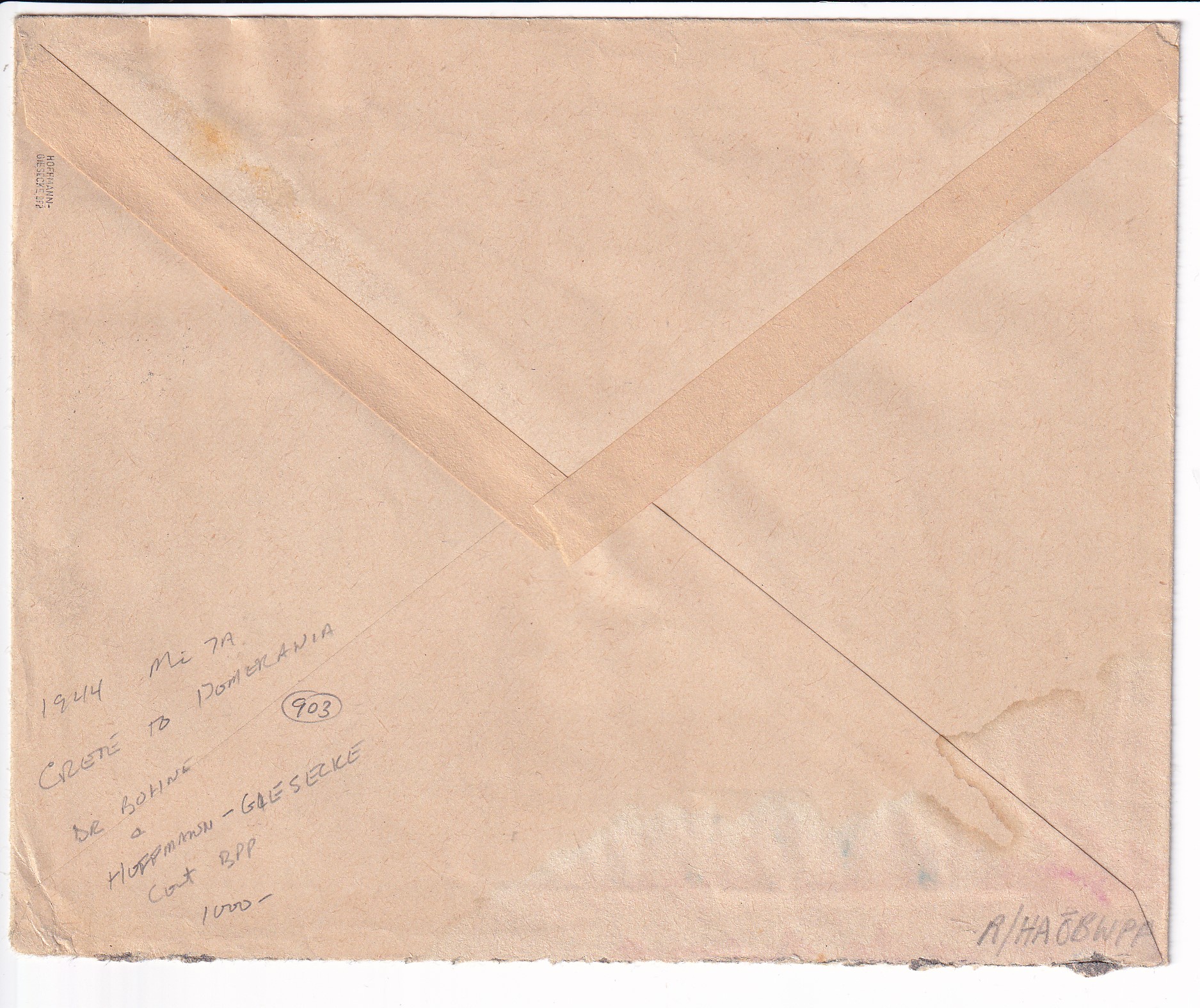 WW2: 1944 German Feldpost, CRETE to Pomerania, Germany (Dr Bohine & Hoffmann-Giesecke BPP certs. stamps Michel #7A.