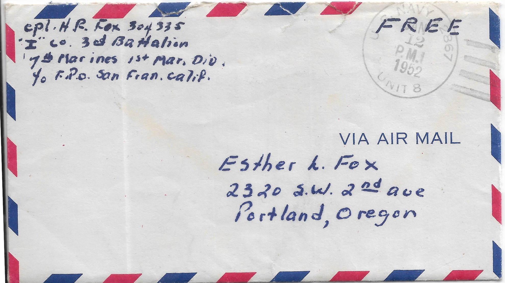 Korean War: 1952 Navy 2867 Unit 8, 7th Marines, 1st Mar Div, Jamestown Line, 38th Parallel to Portland, Or Airmail, w.Ltr.