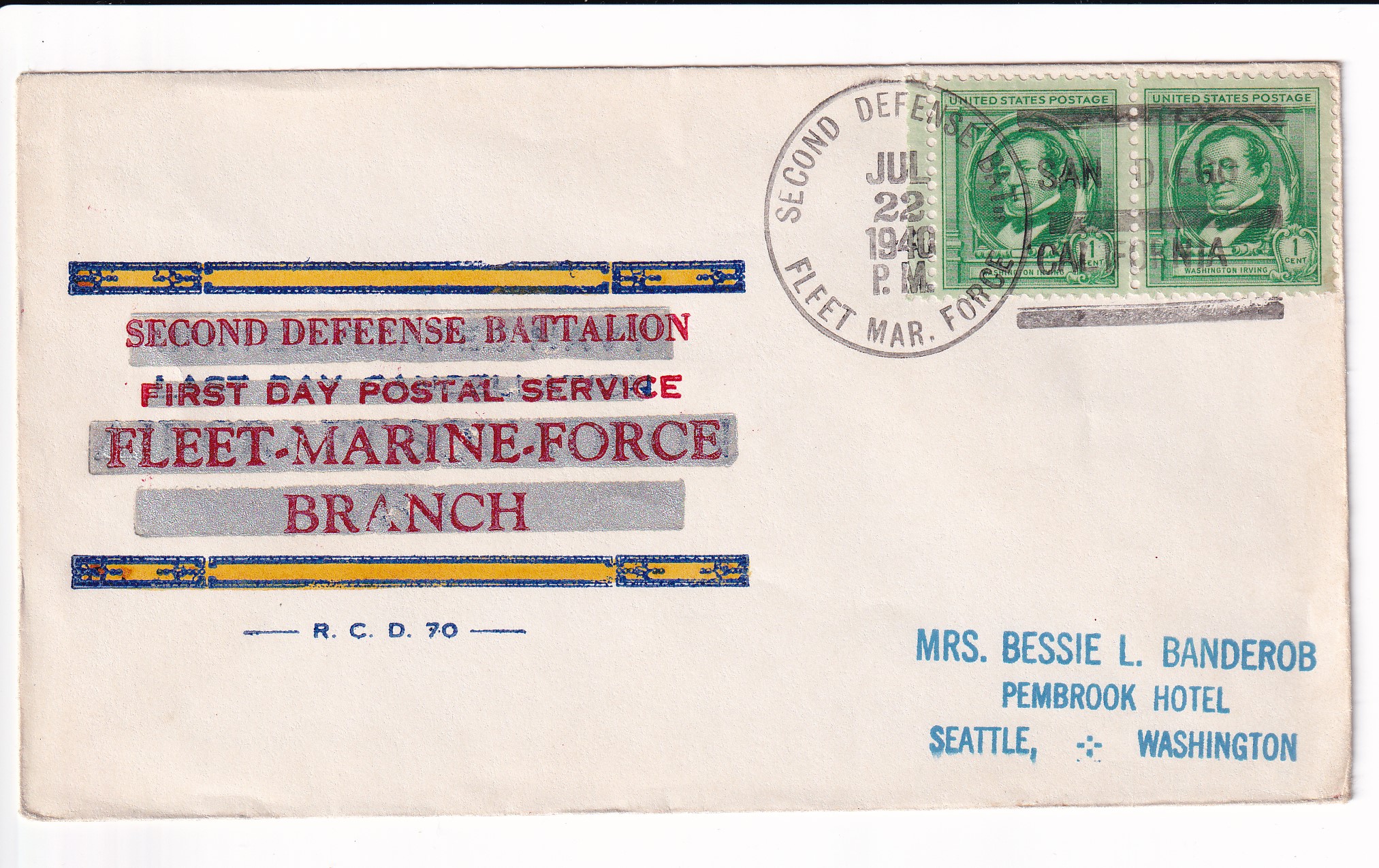 1940 1st Day of Postal Service, 2nd Fleet Marine Force to Seattle, Wa.
