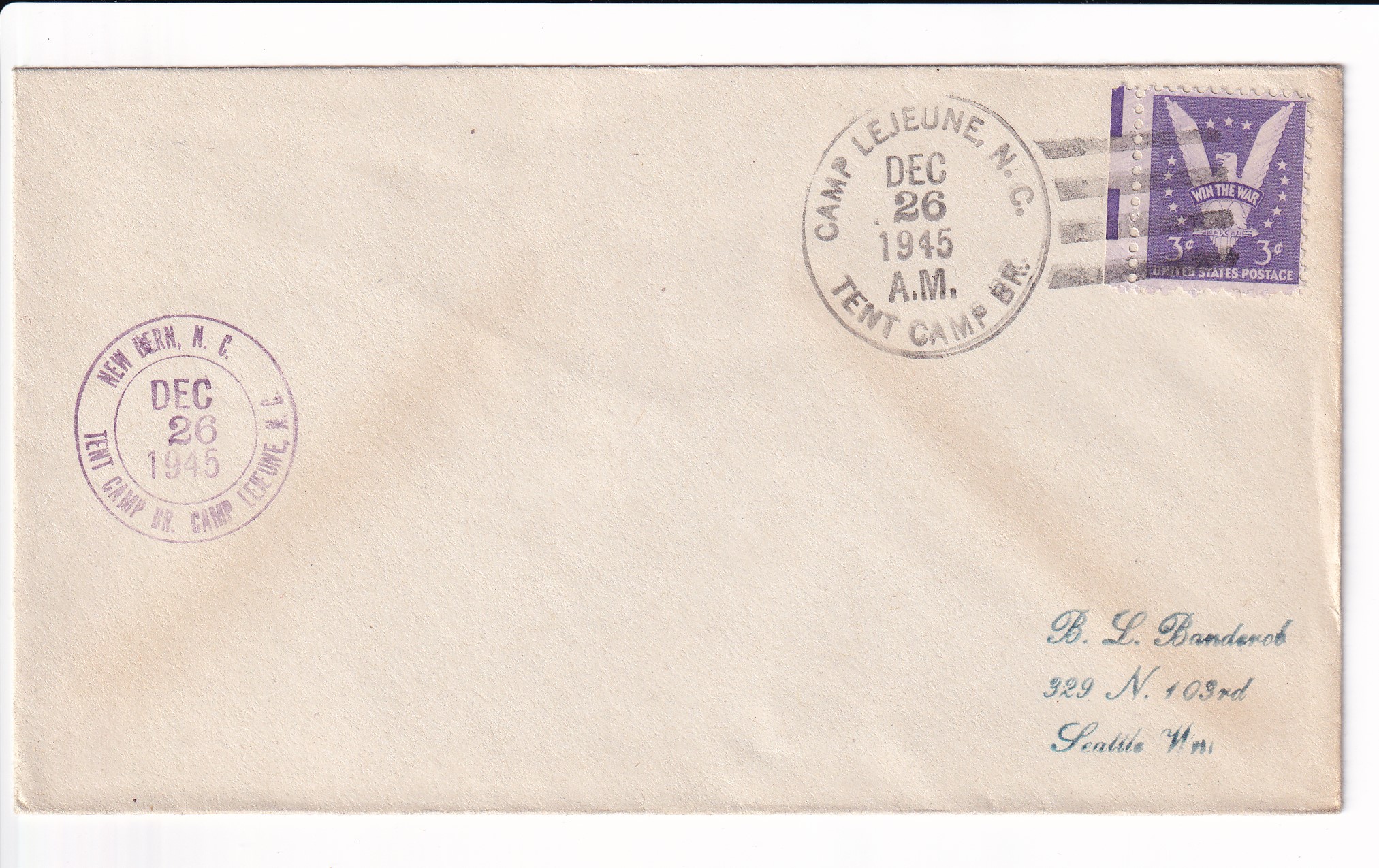 1945 Camp Lejeune, Tent Camp Branch, NC to Seattle, Wa.
