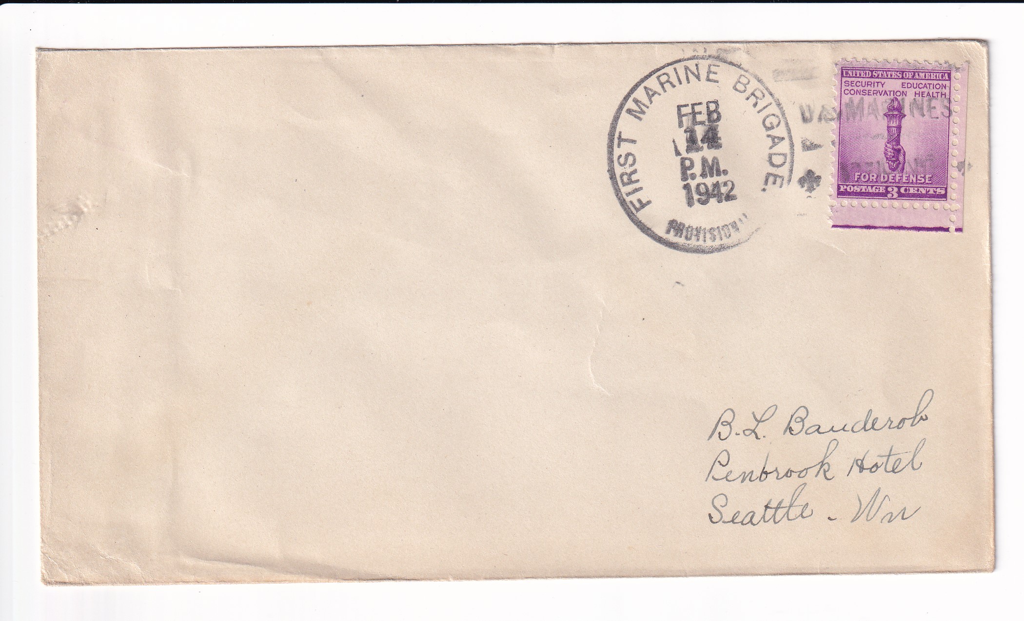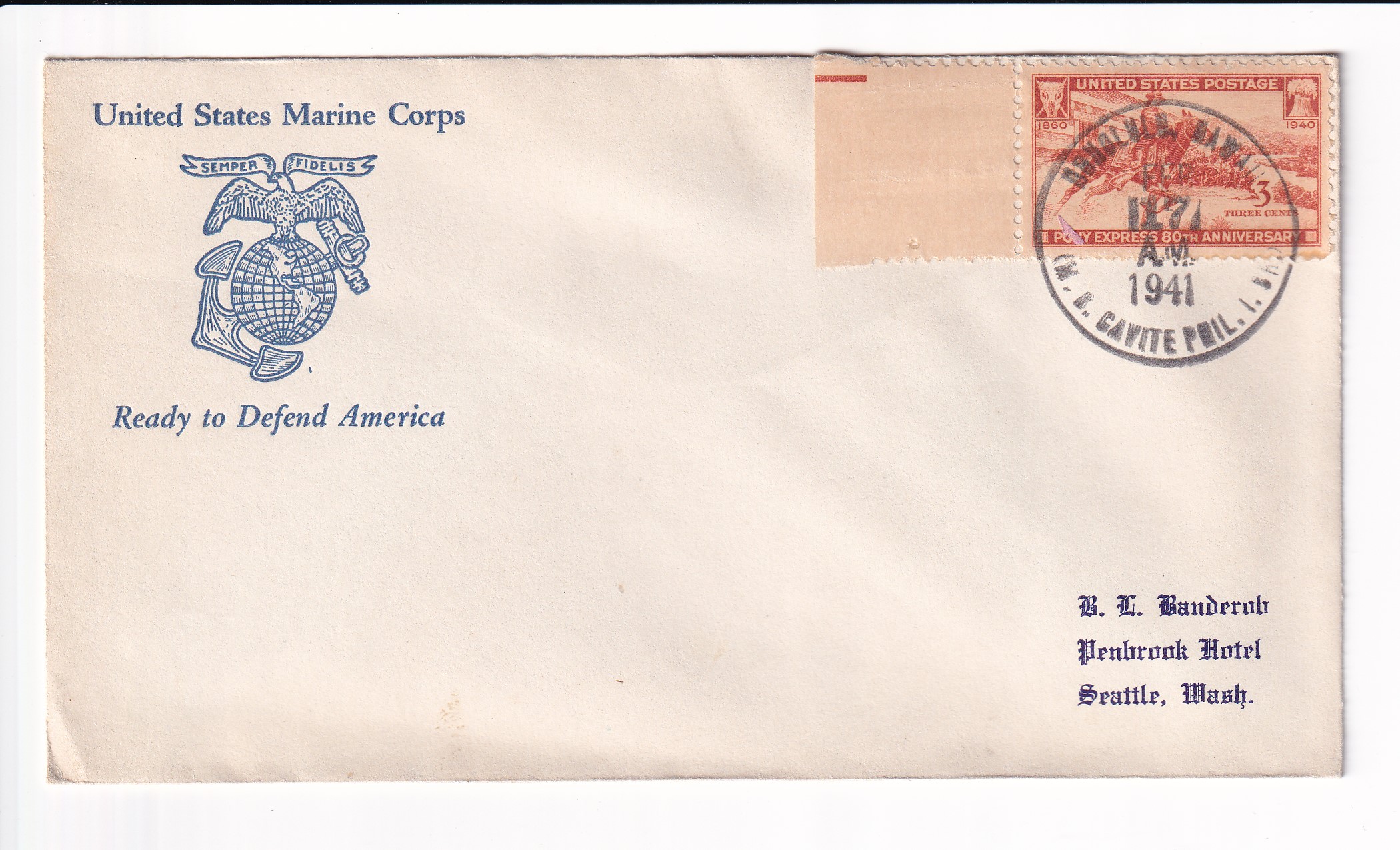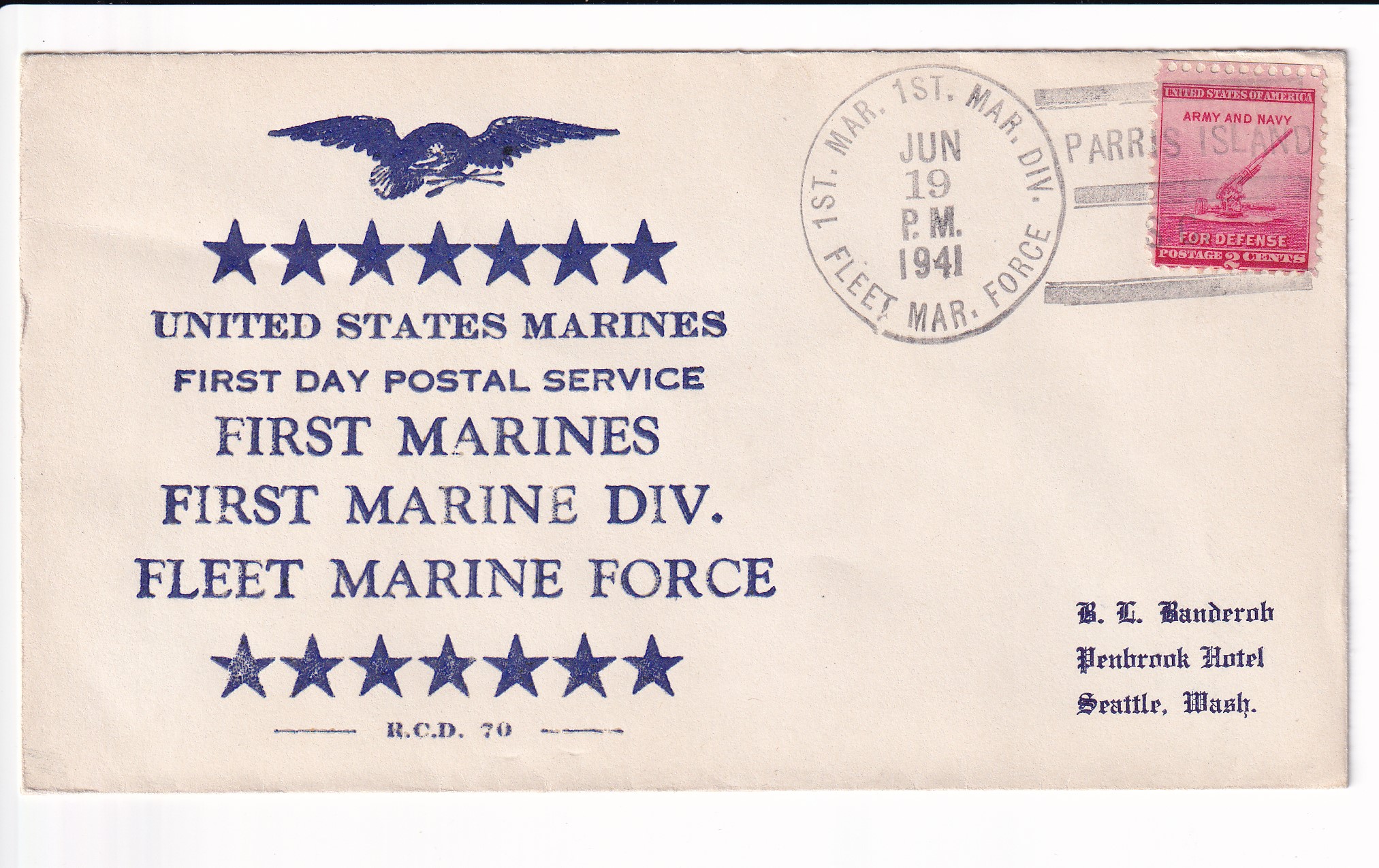 1941 1st Day Postal Service, 1st Marine, 1st Marine Div, FMF to Seattle, Wa.