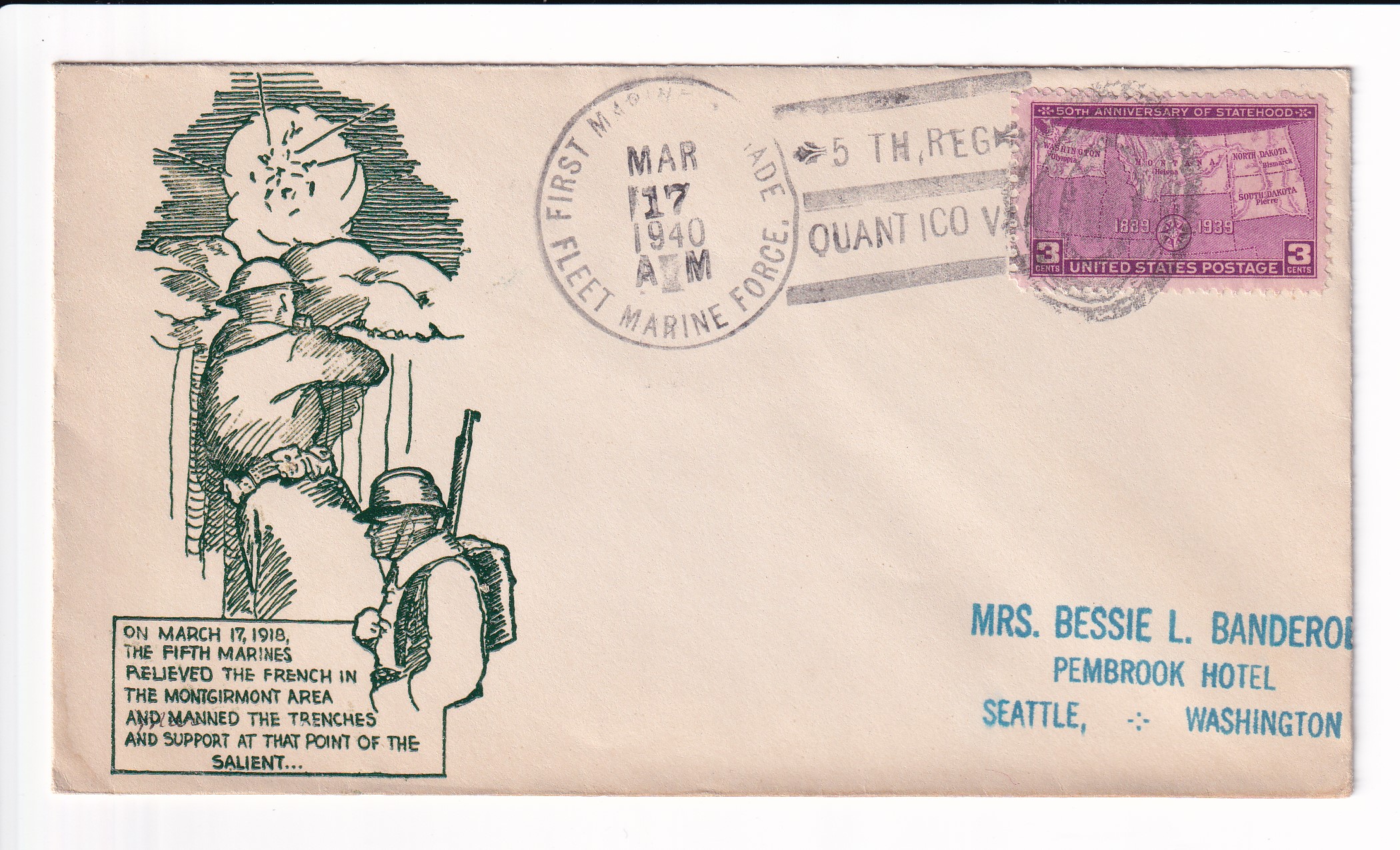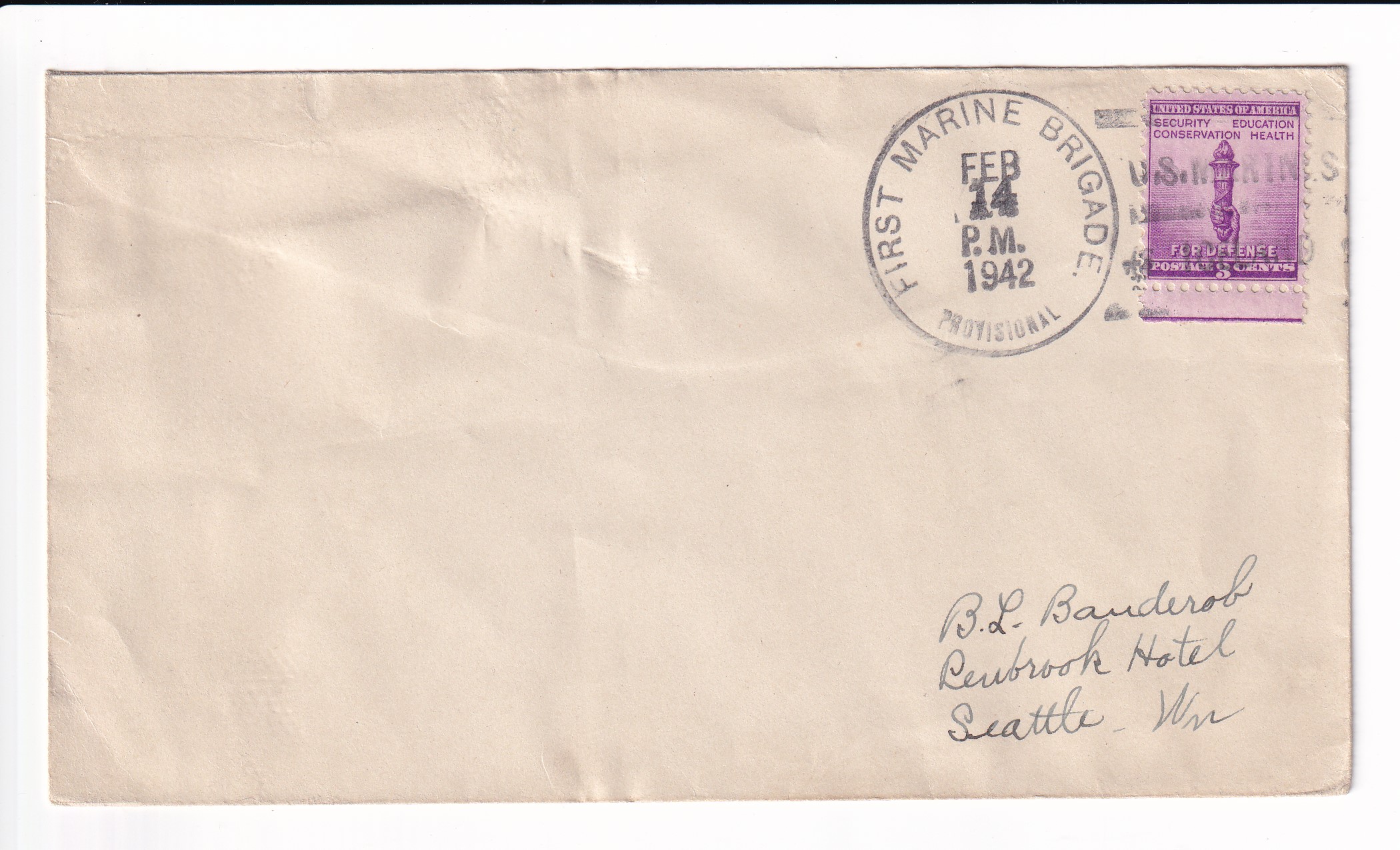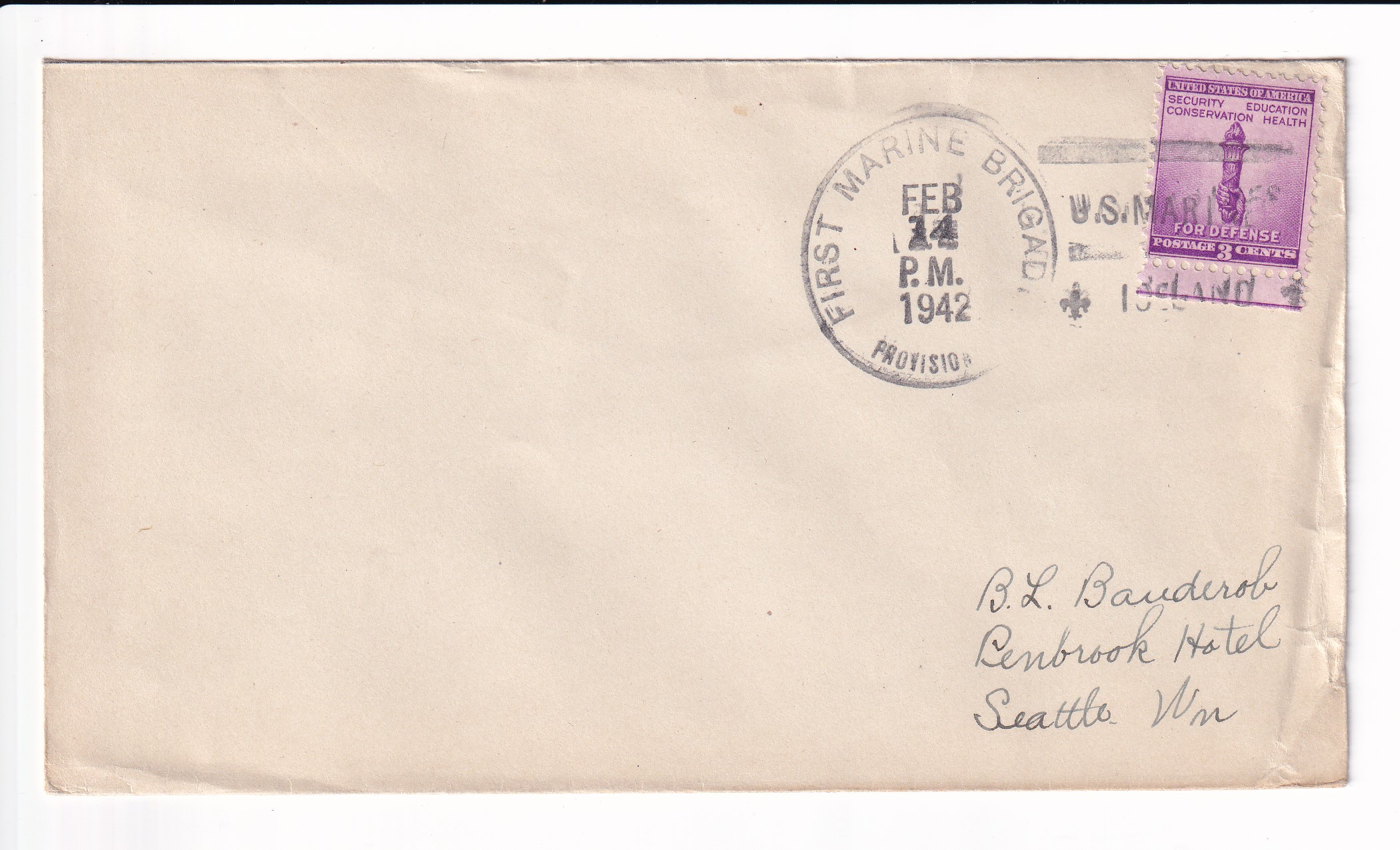 1941 1st Day Postal Service, 1st Marine, 1st Marine Div, FMF to Seattle, Wa.