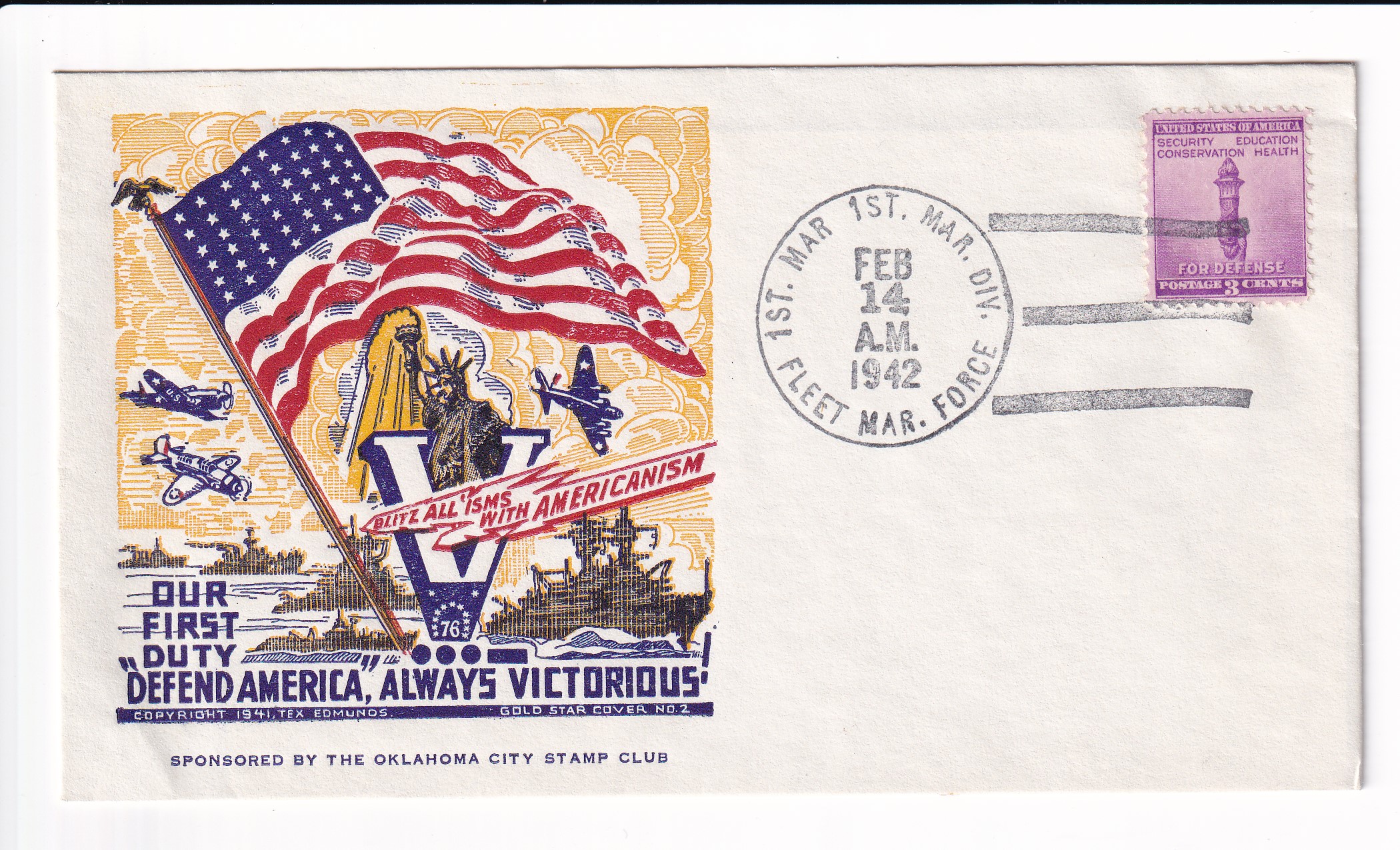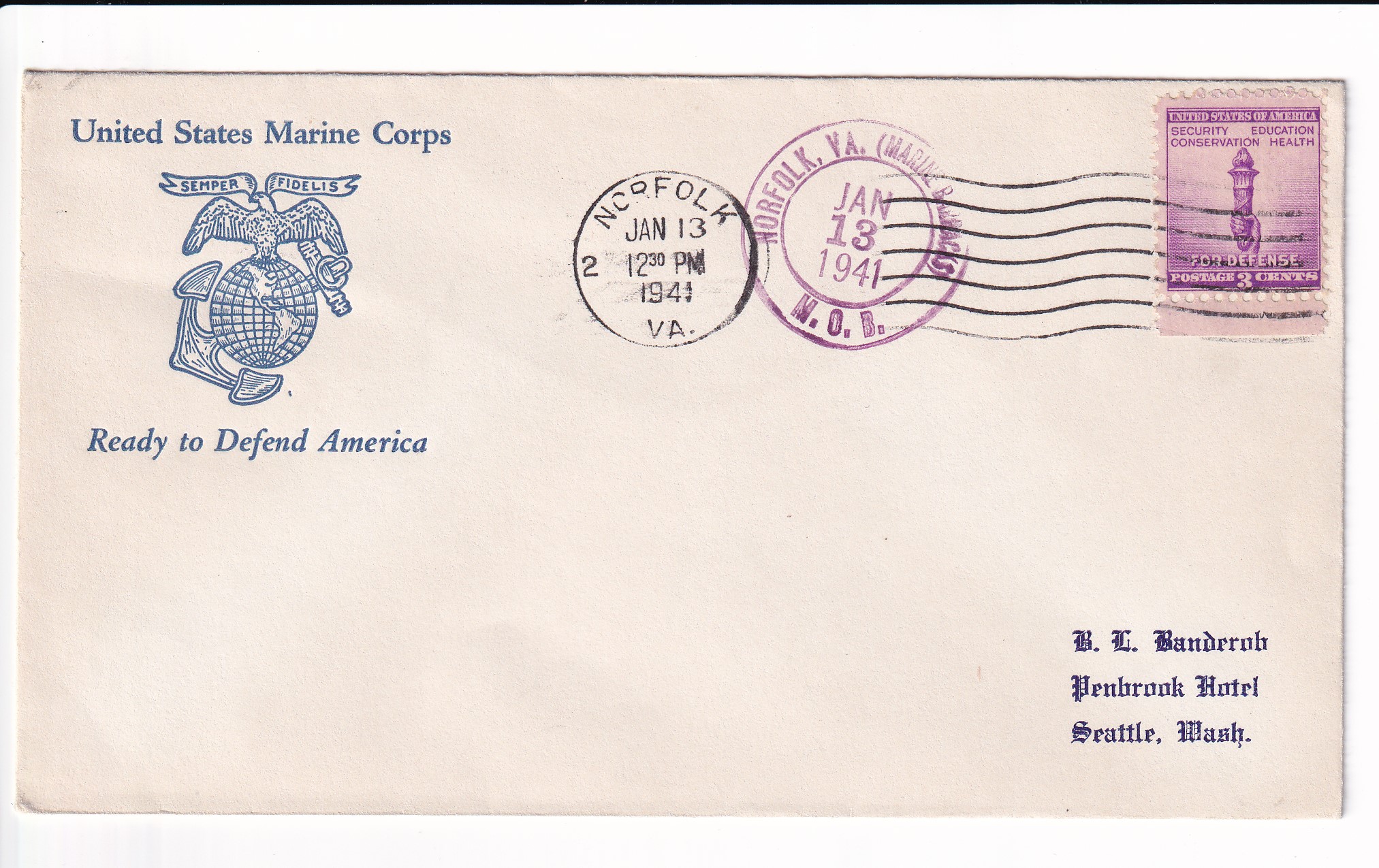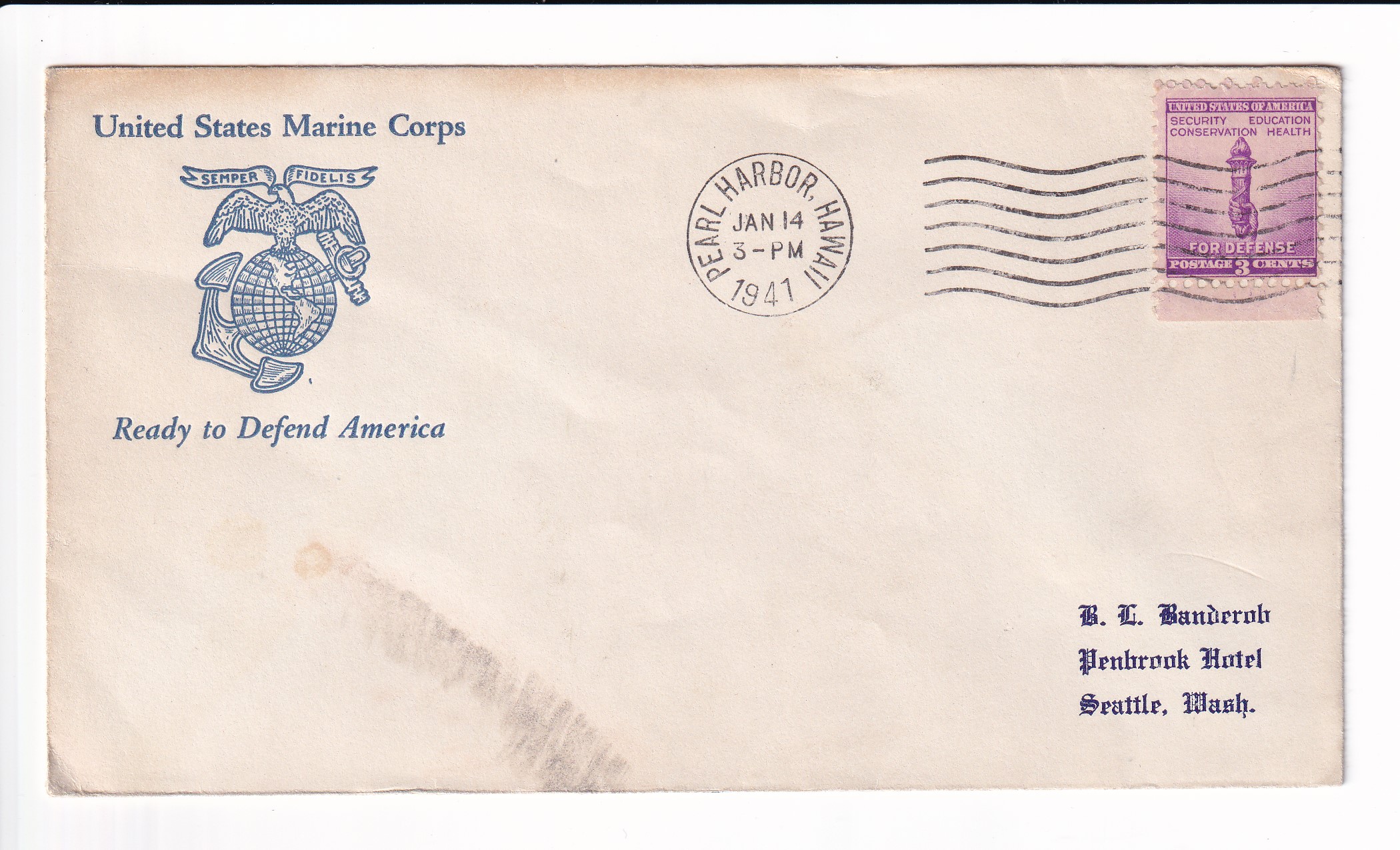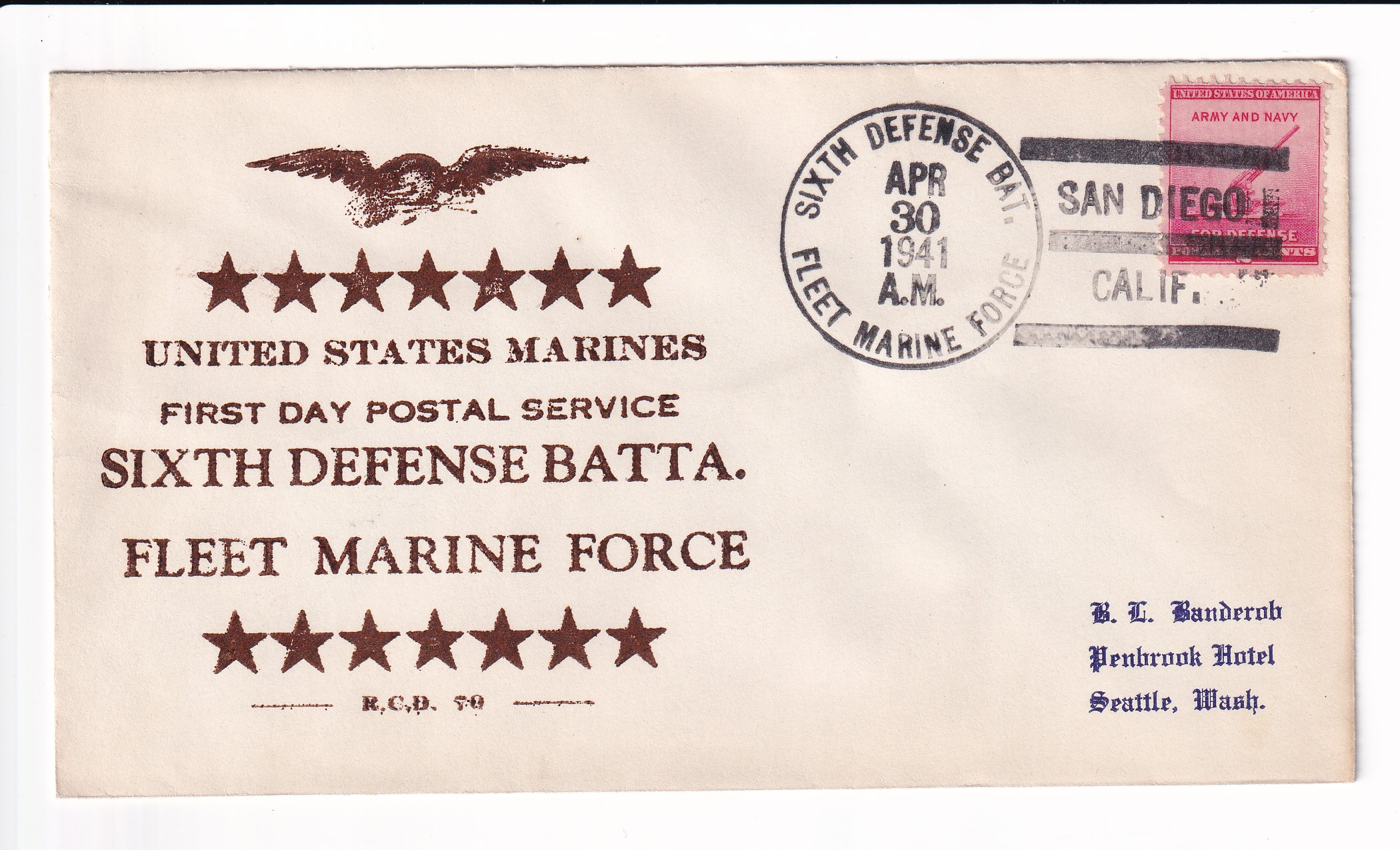 1941 1st Day Postal Service, 6th Defense Batt, FMF to Seattle, Wa.