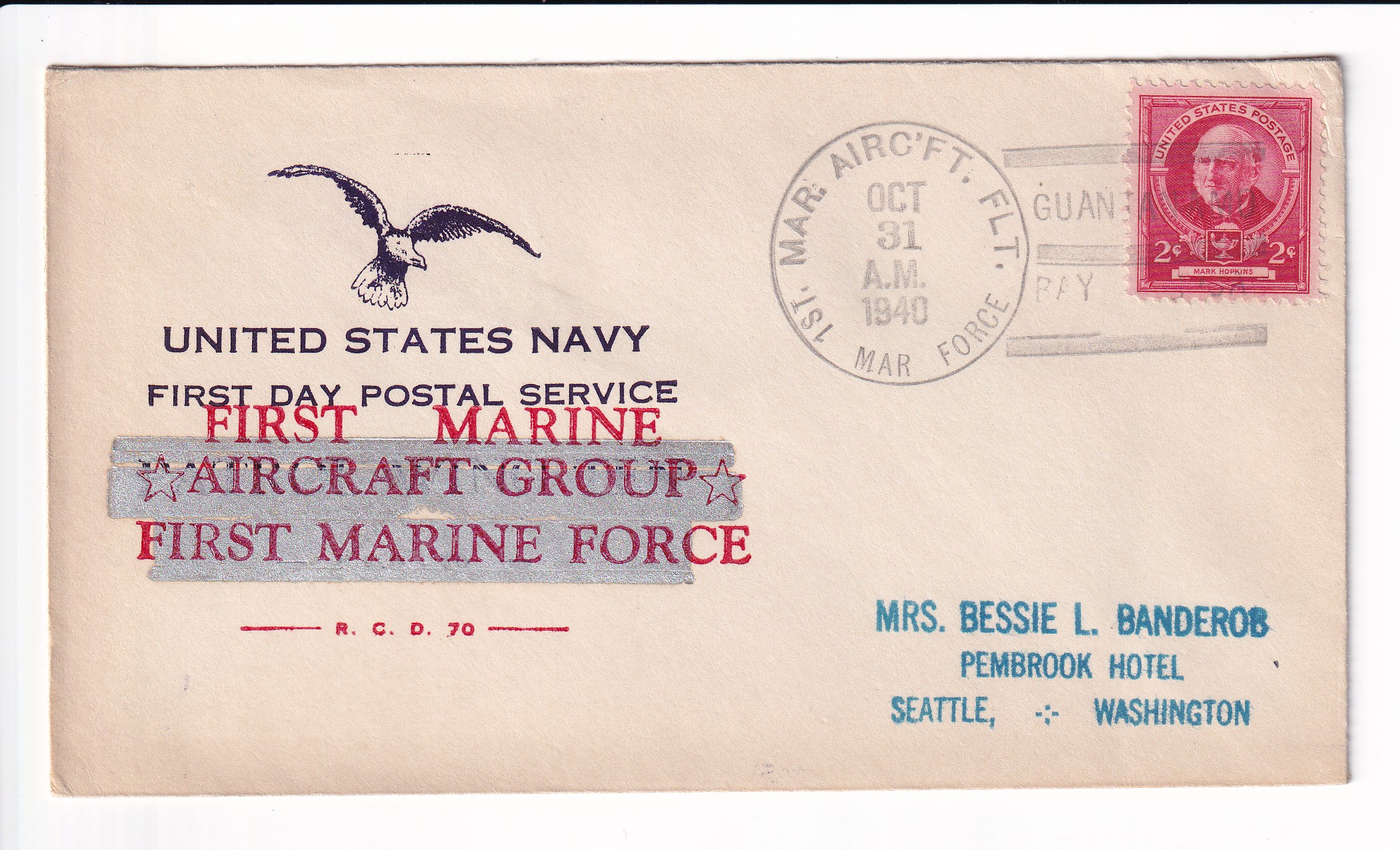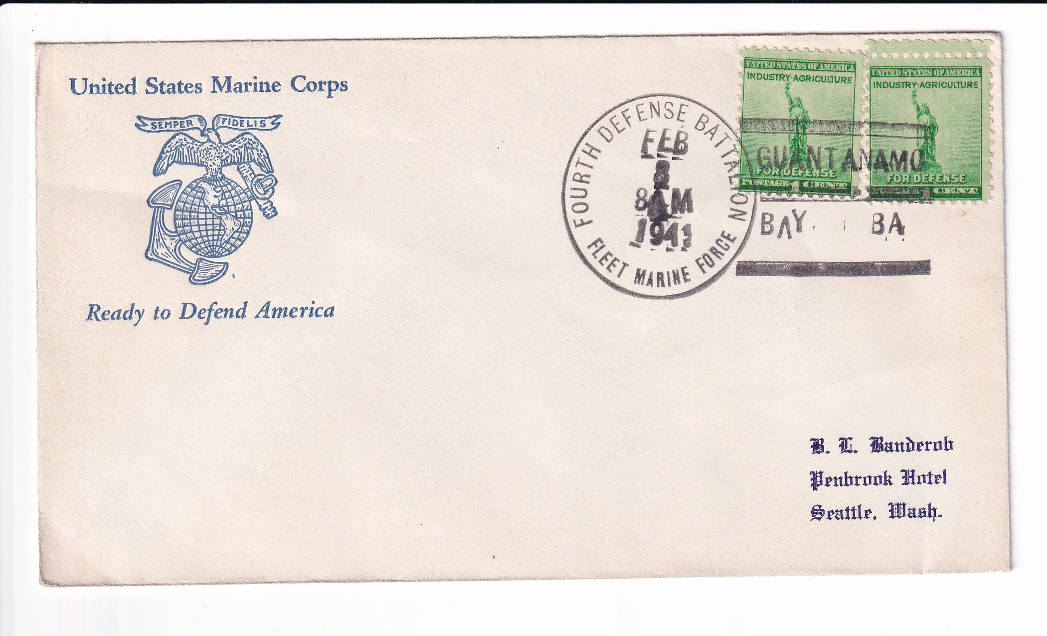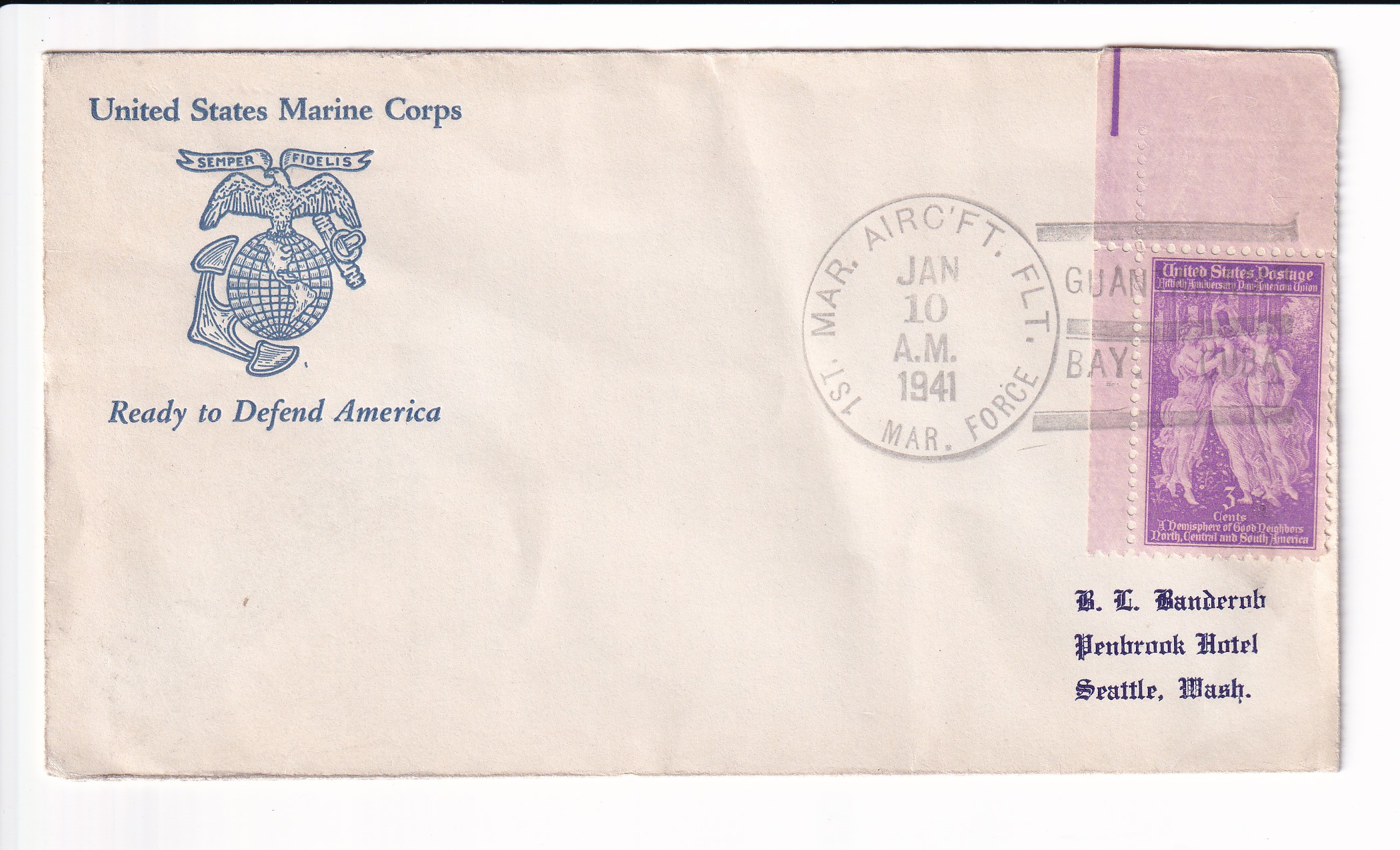 1940 1st Day Postal Service, 1st Marine Aircraft Flt, FMF Guantanamo Bay to Seattle, Wa.