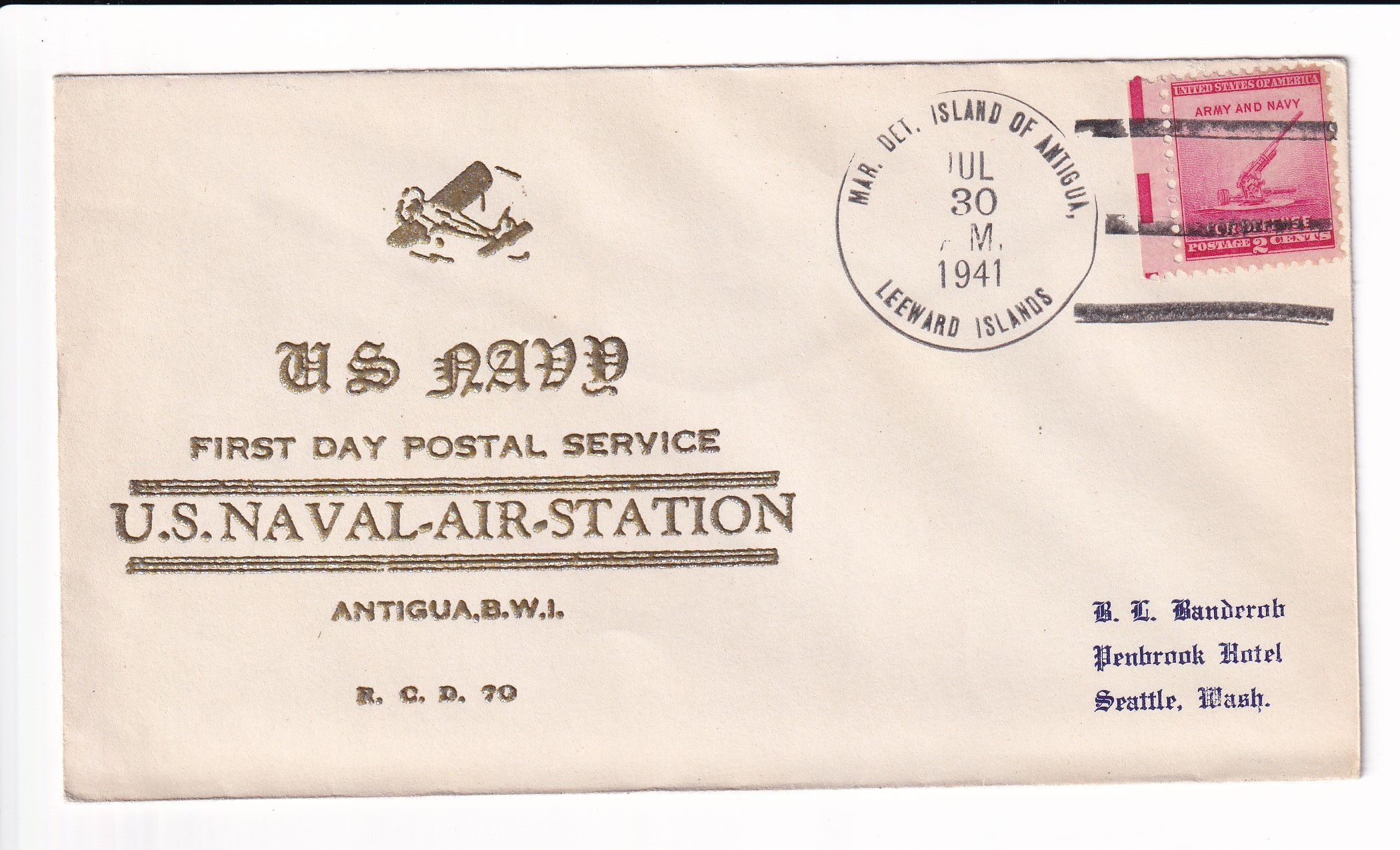 1941 1st Day Postal Service, Marine Detachment Antigua, Leeward Islands to Seattle, Wa.