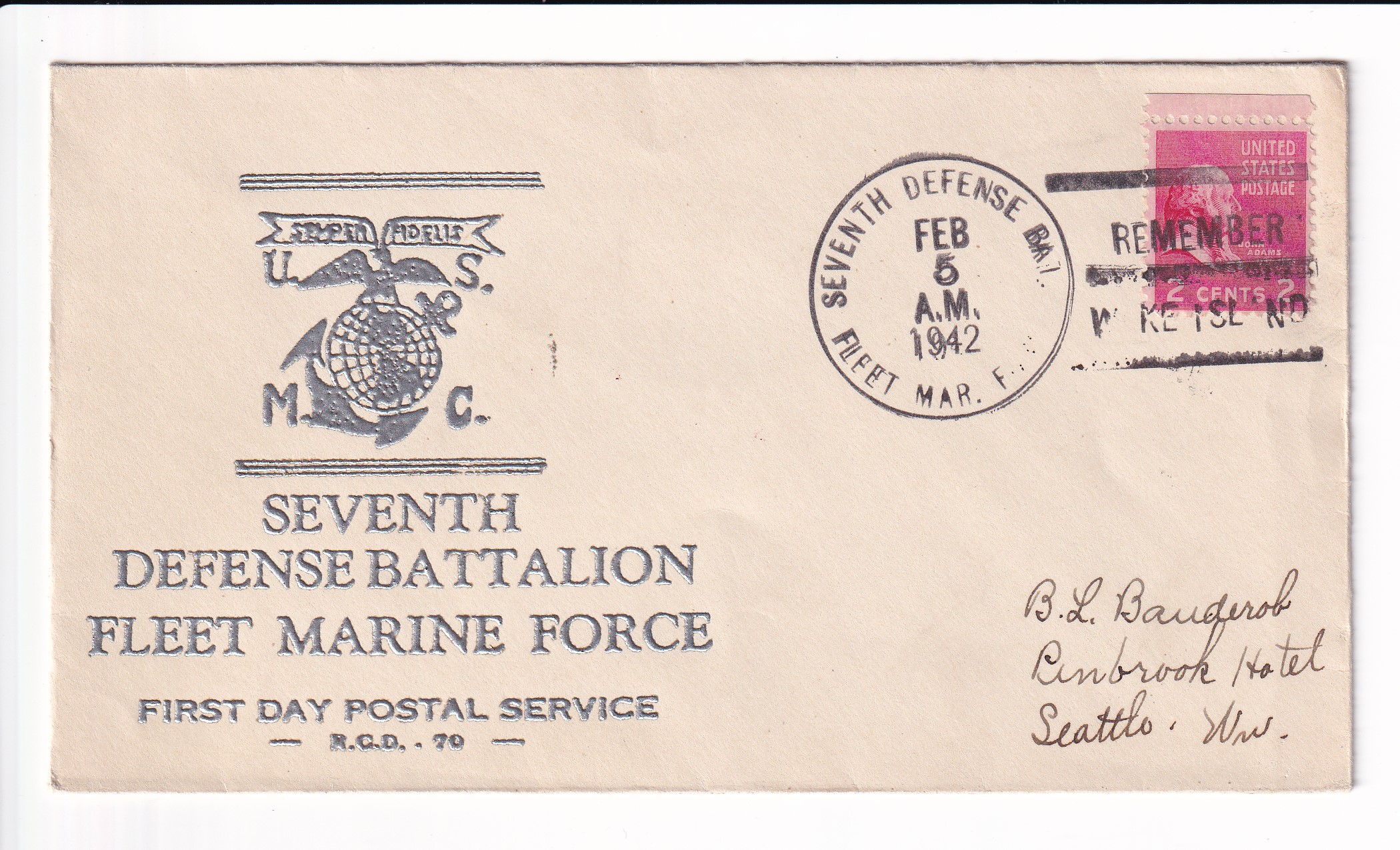 1942 1st Day Postal Service, 7tht Marine Defense Batt, FMF to Seattle, Wa.