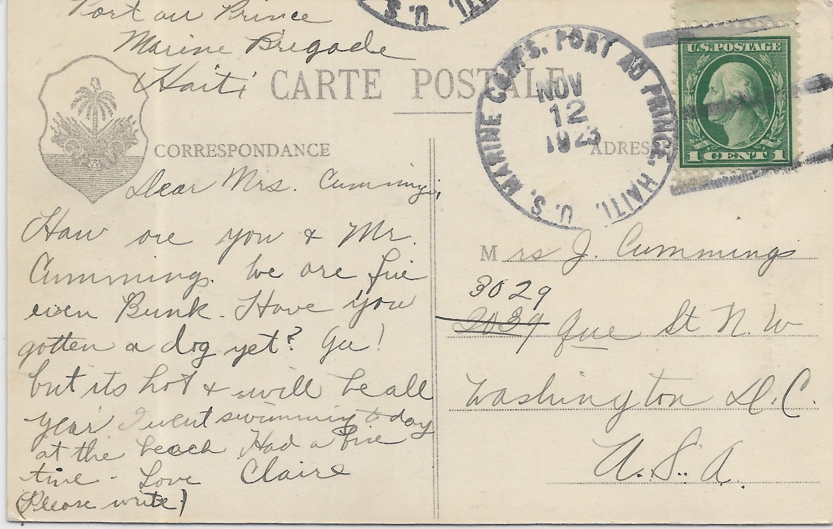 1923 USMC in Port au Prince, Haiti to New York, NY.