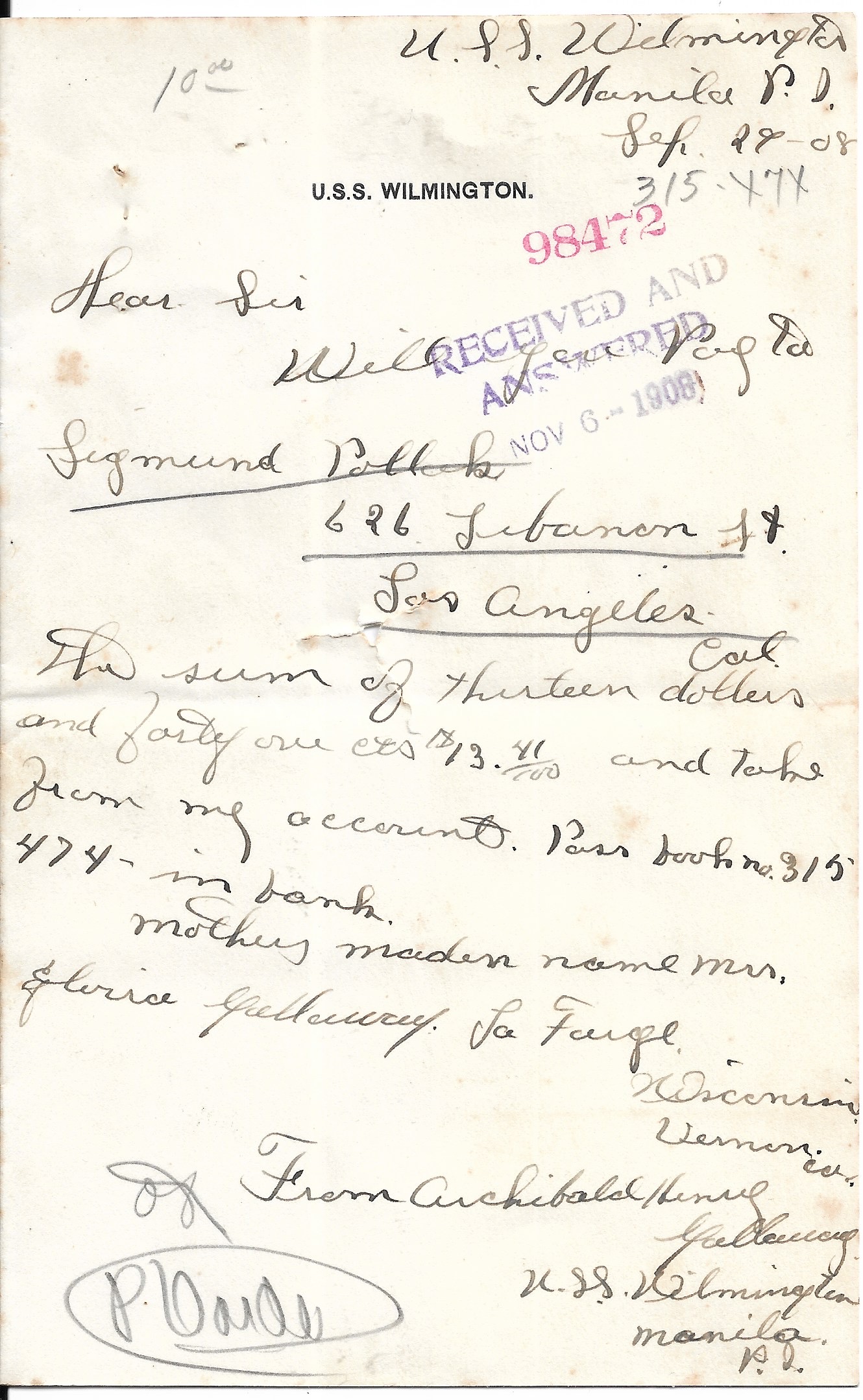 1908 USS Wilmington, Manila, Philippines to San Francisco, Ca w/Letter. stamp is torn off cover.
