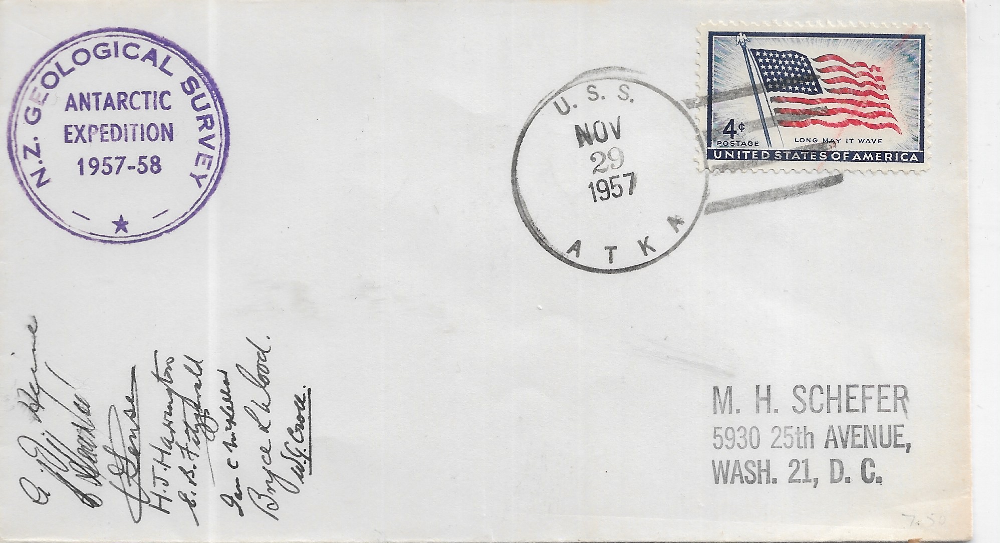 1957 USS Atka AGB-3 to Washington DC N.Z Geological Survey signed by Members.