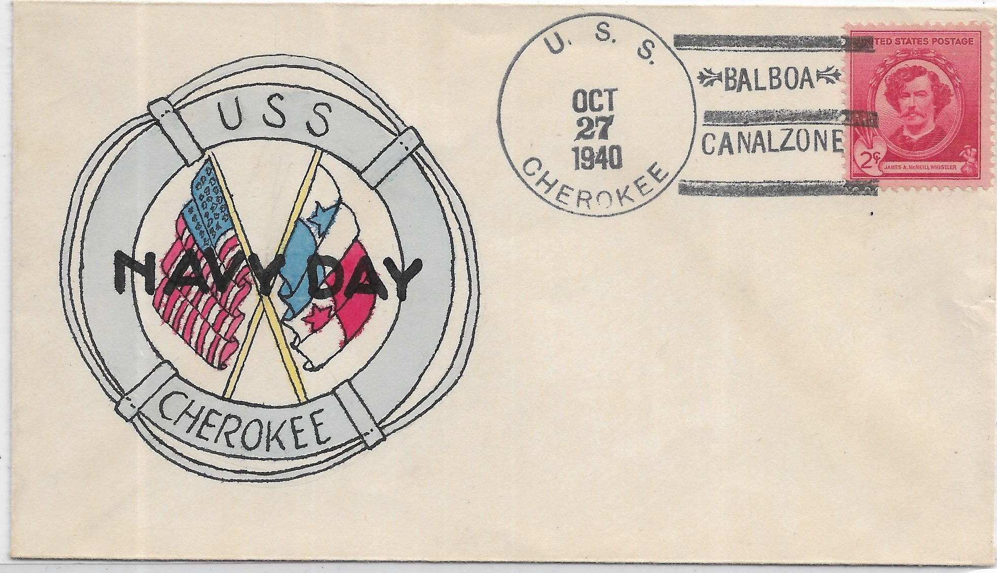 1940 USS Cherokee AT-66, Balboa, Canal Zone Navy Day Hand Colored cachet.