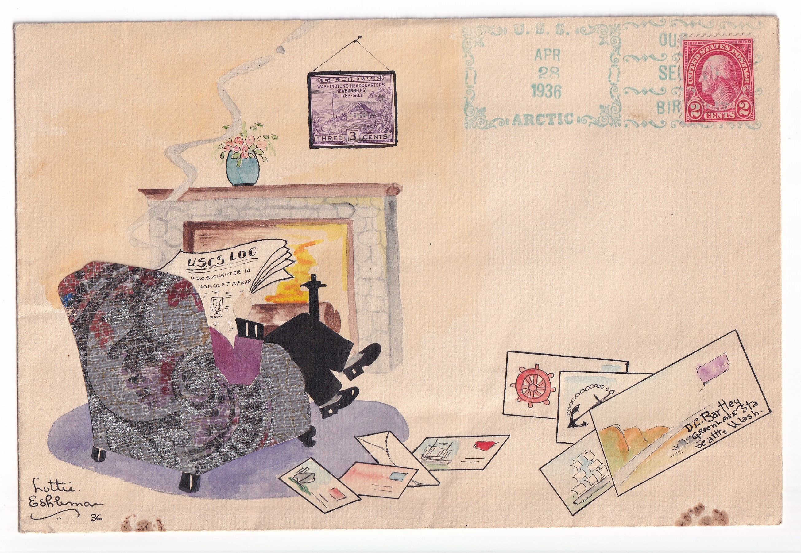 1936 USS Arctic to Seattle, Wa Hand Drawn cachet by Lottie Eshliman USCS 262 (Only 40 overs Produced).