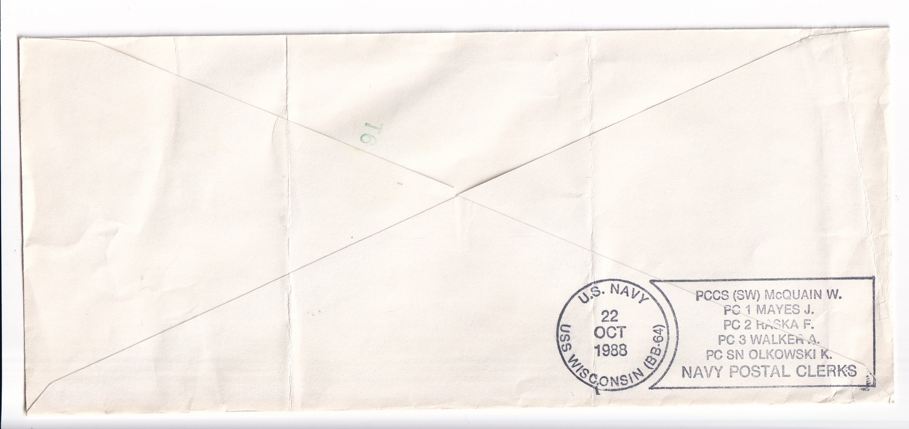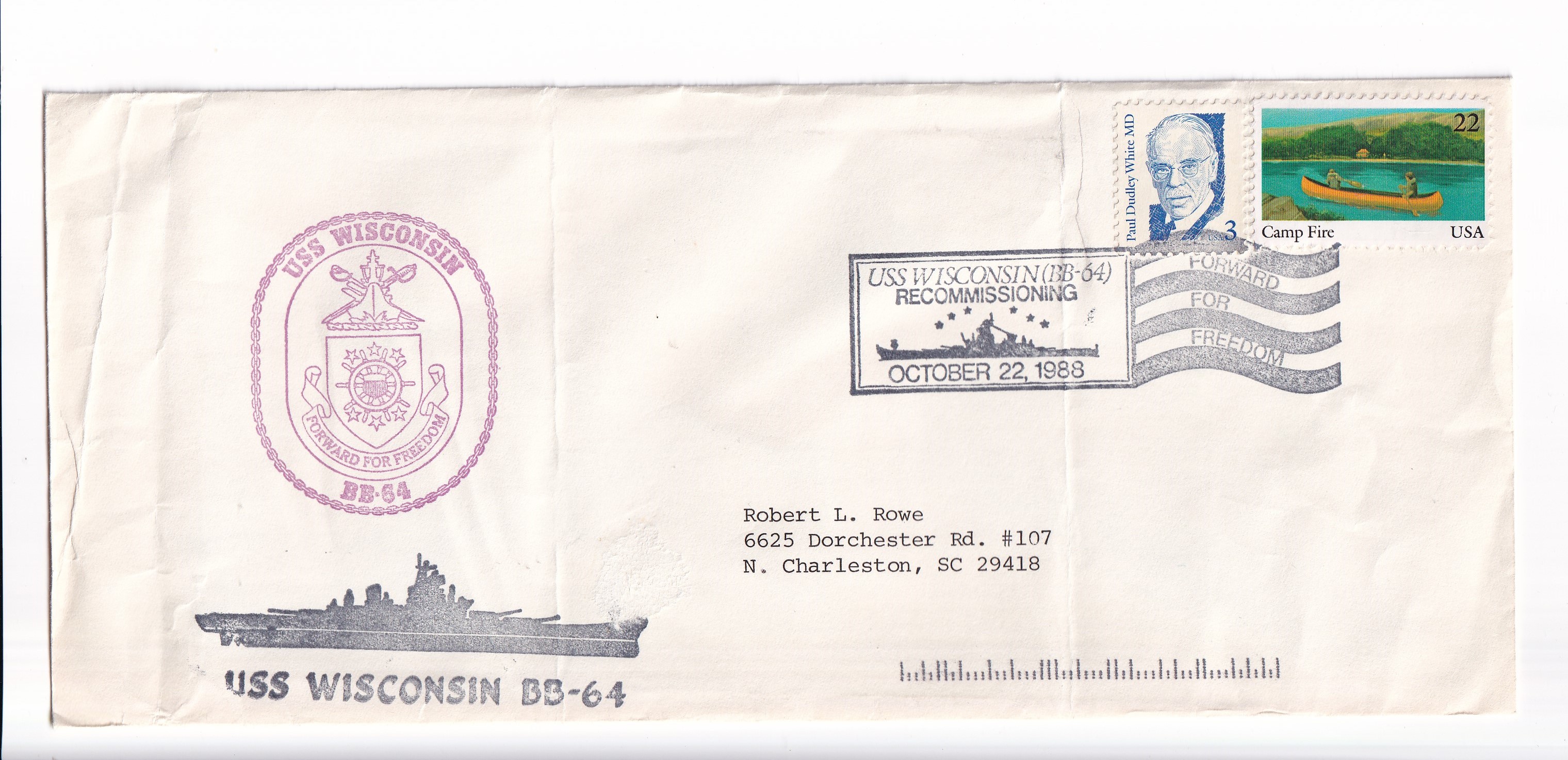 | 1988 USS Wisconsin BB-64, Recommissioned Hand Colored cachet. | Price: $5.00