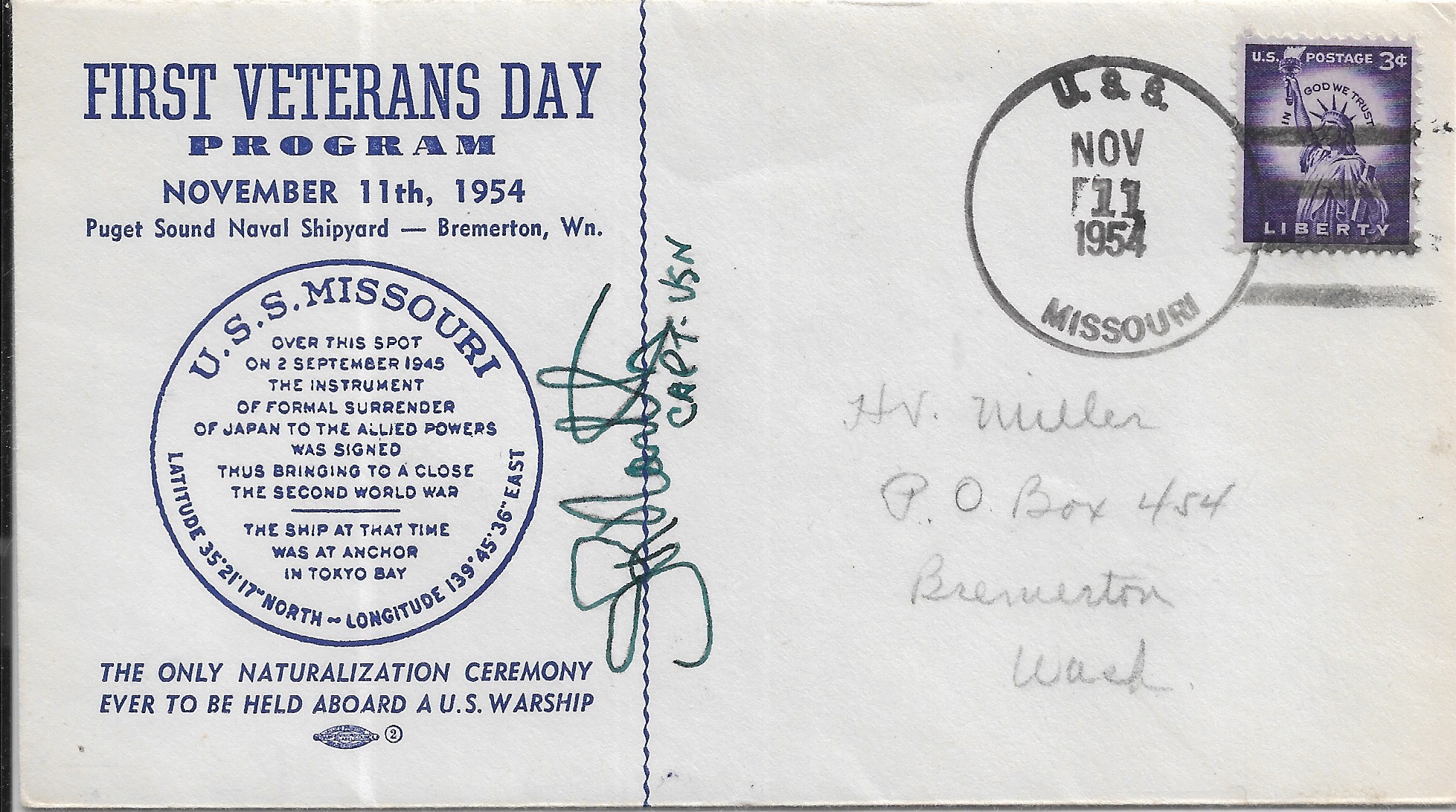 | 1954 USS Missouri BB-63, Veterans Day signed by C.O. | Price: $10.00