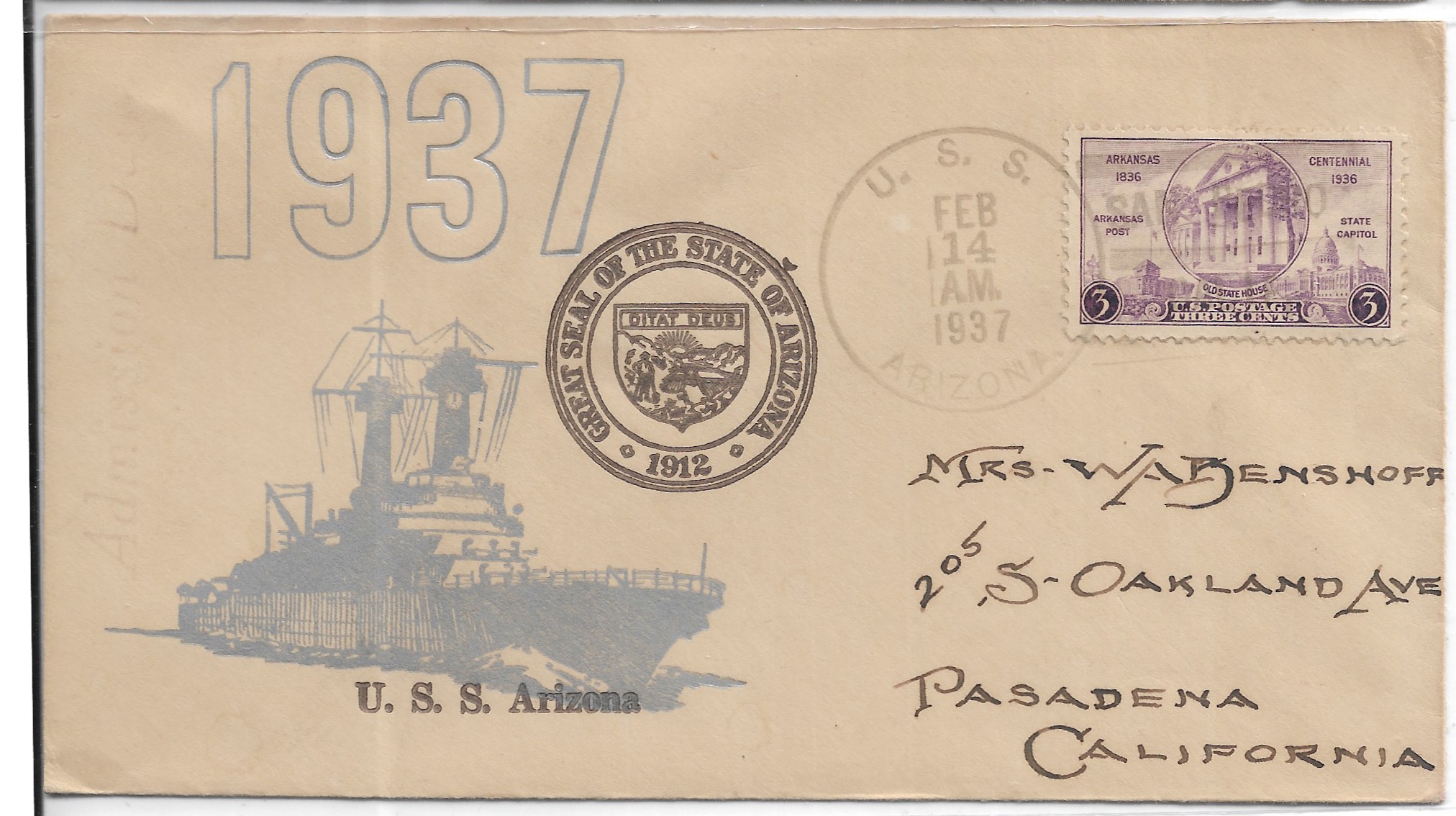 1937 USS Arizonia BB-63 to Pasadena, Ca.