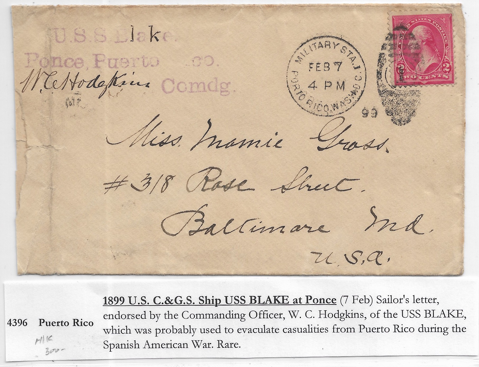 1899 USS Blake, Ponce, Puerto Rico to Baltimore, MD endorsed by C.O.
