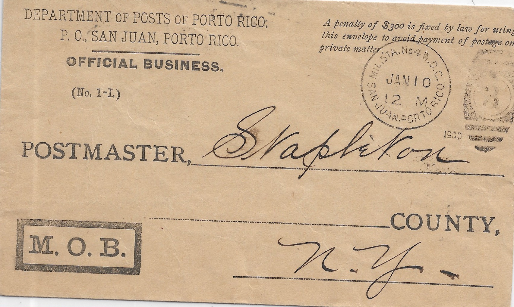 1900 Military Station 4, San Juan, Puerto Rico to Stapleton, NY.