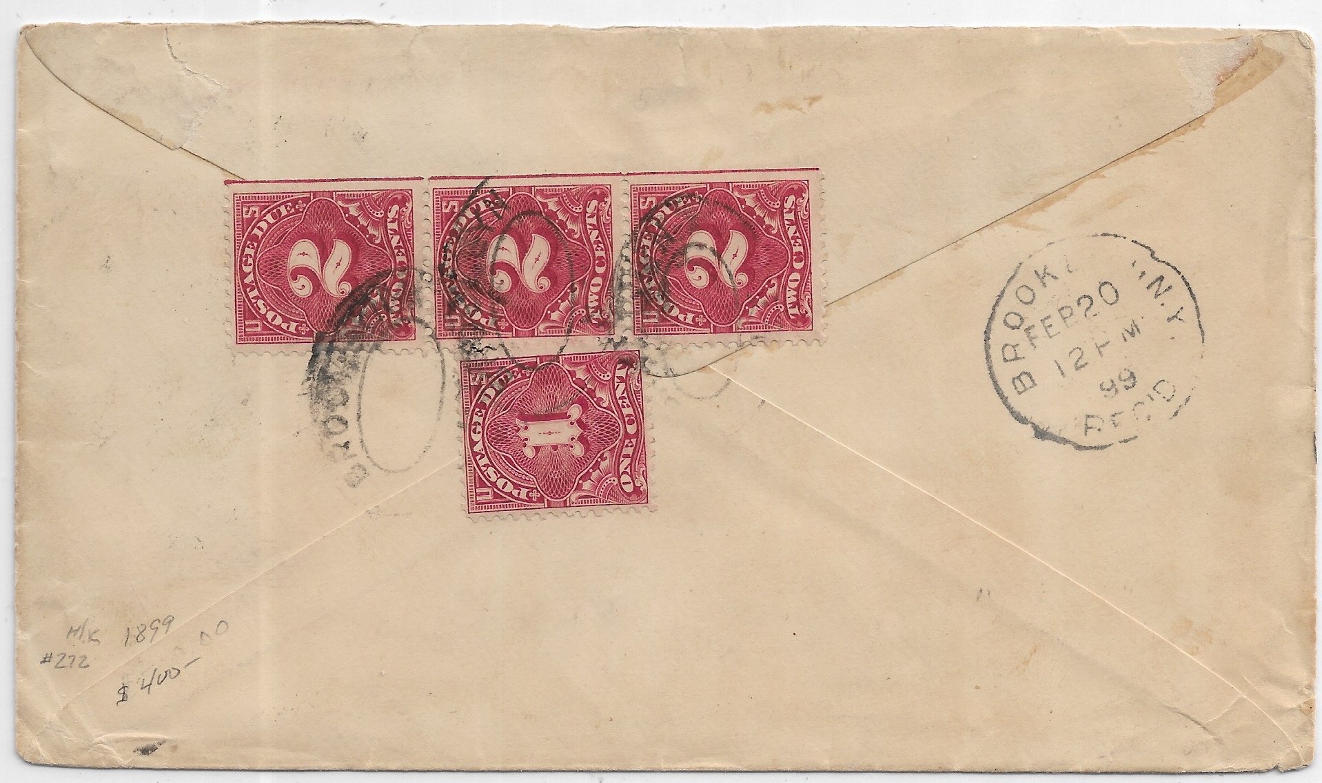 1899 Military Station 1, Ponce, Puerto Rico to Brooklyn, NY, Postage Due on Reverse. back stamped Brooklyn.