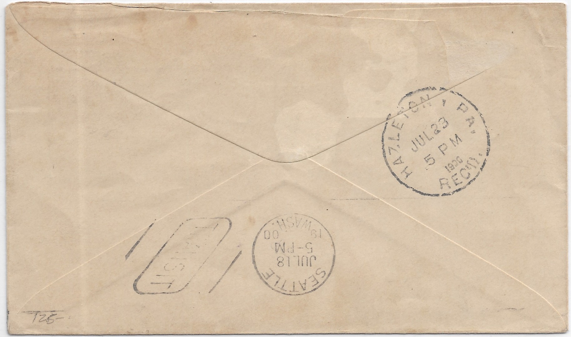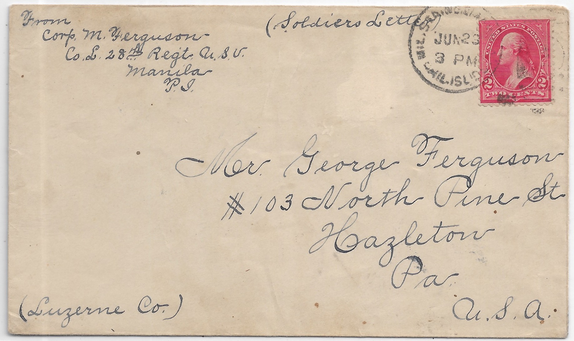 Spanish-American War: 1900 28th Regt, USV, Manila, Philippines to Hazeltown, Pa. back stamped Seattle & Hazeltown.