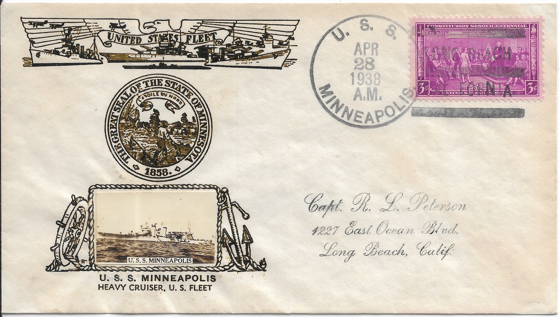 1938 USS Minneapolis CA-36, Long Beach to Long Beach, Ca Crosby cachet.