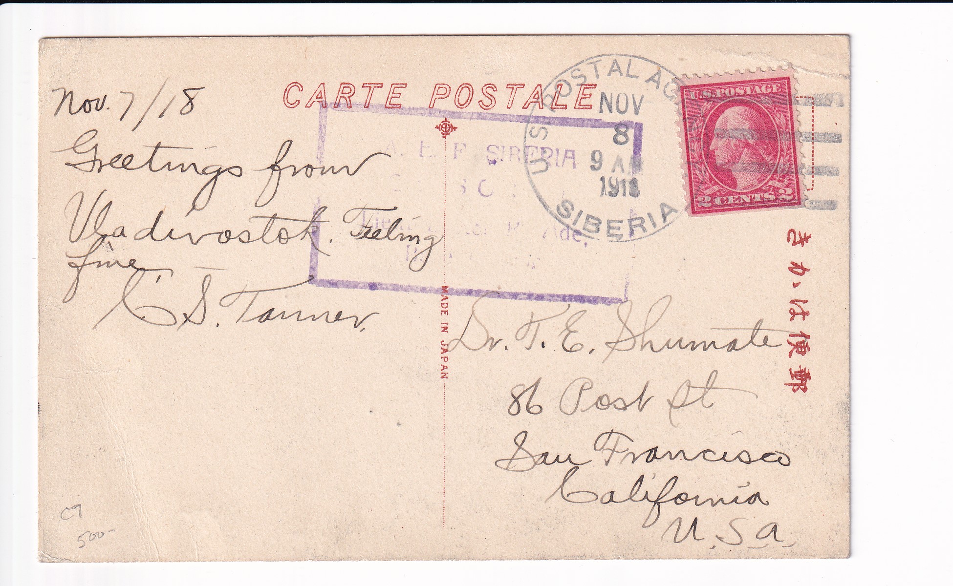 WW1: 1918 Safe Arrival Card fm Capt Roger Strans, US Army, AEF Siberia (Extremely Rare). Postmarked in San Francisco to Merchants Exchange Building, San Fran 1918.