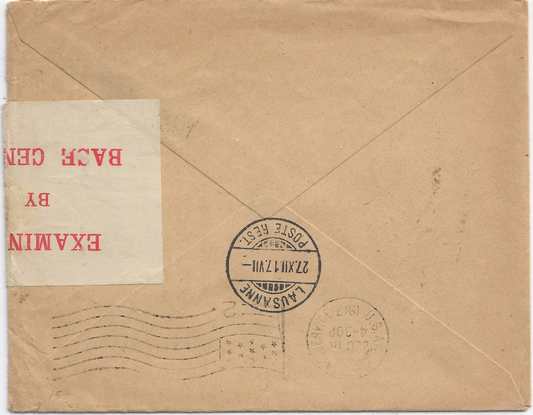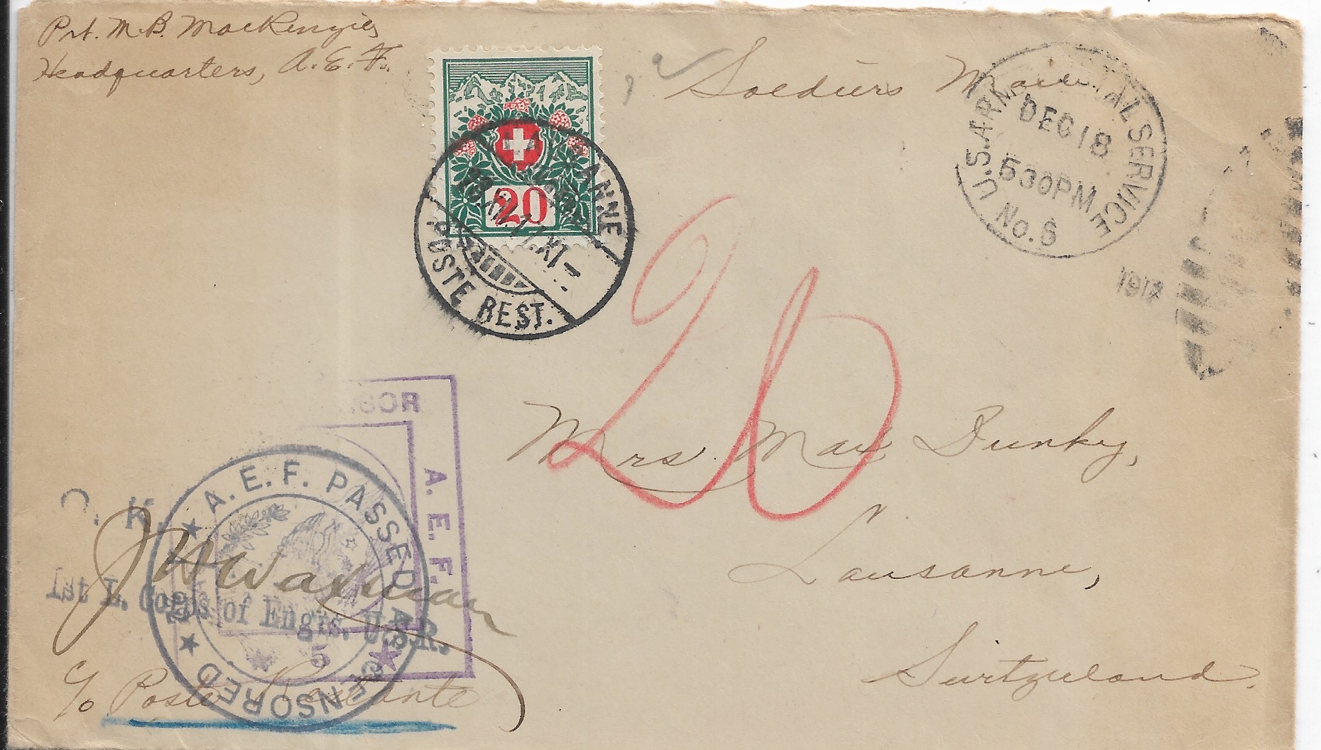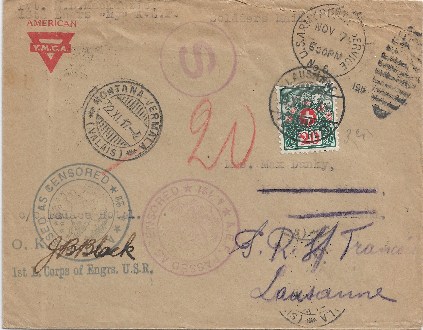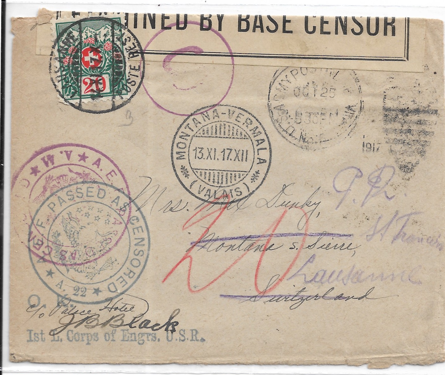 1917 APO 6, AEF France to Montana-Vermala, Switzerland fwd Lausanne w/Swiss Postage Due. back stamped Montana-Vermala & Lausanne.