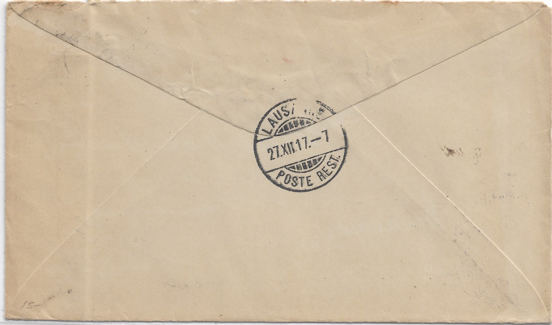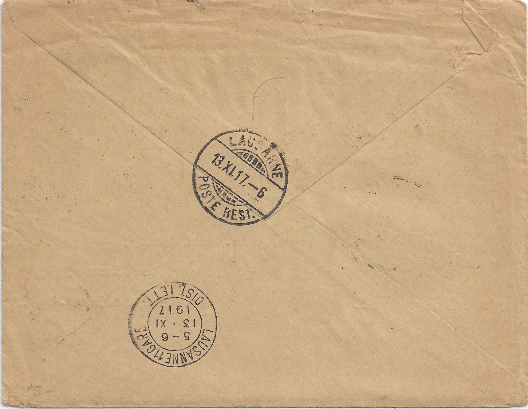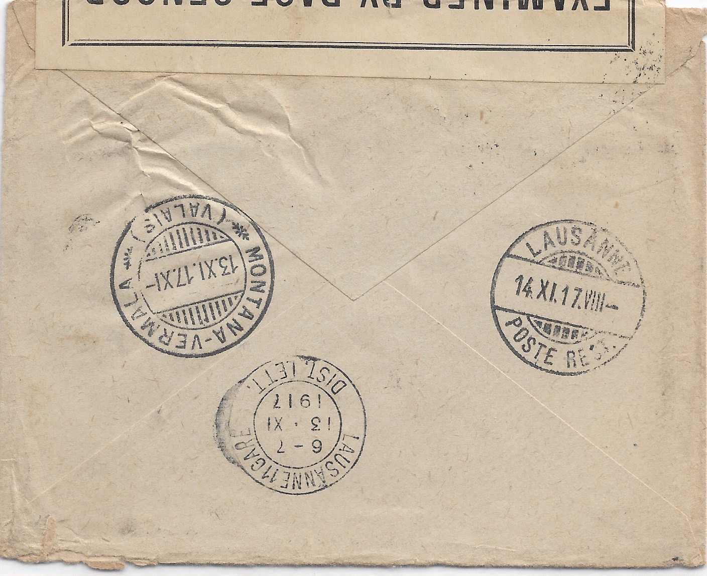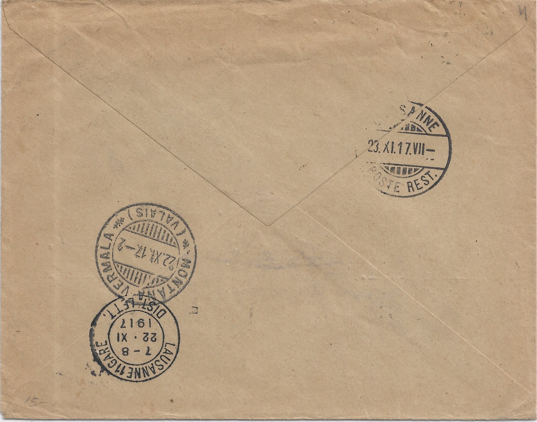 1917 APO 6, AEF France to Montana-Vermala, Switzerland fwd Lausanne w/Swiss Postage Due. back stamped Montana-Vermala & Lausanne.