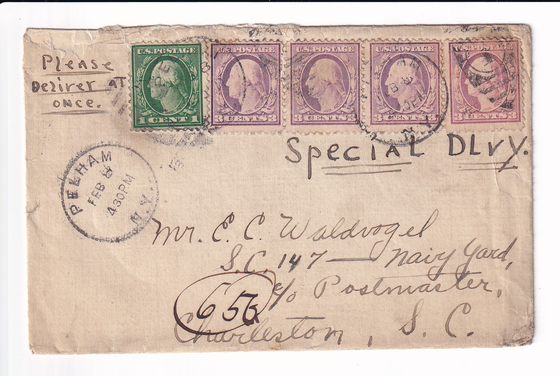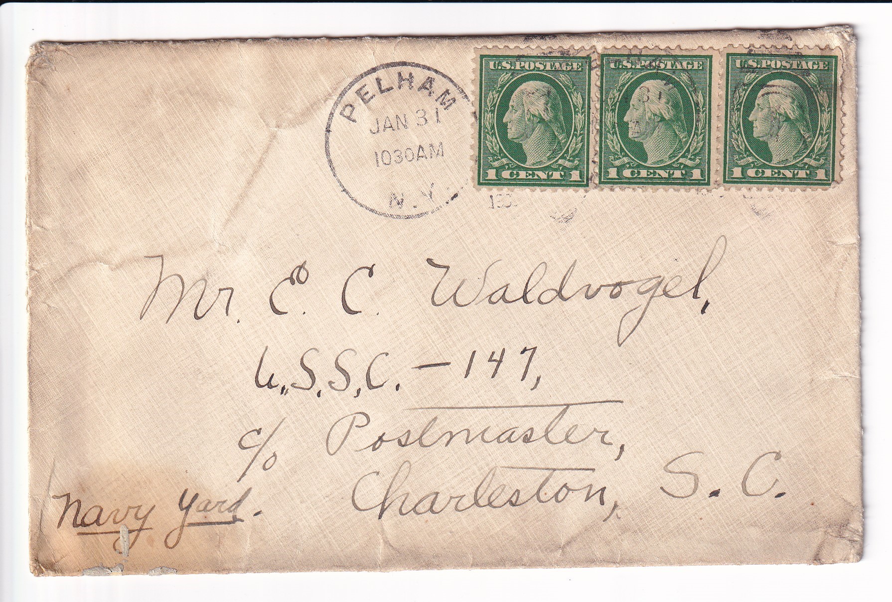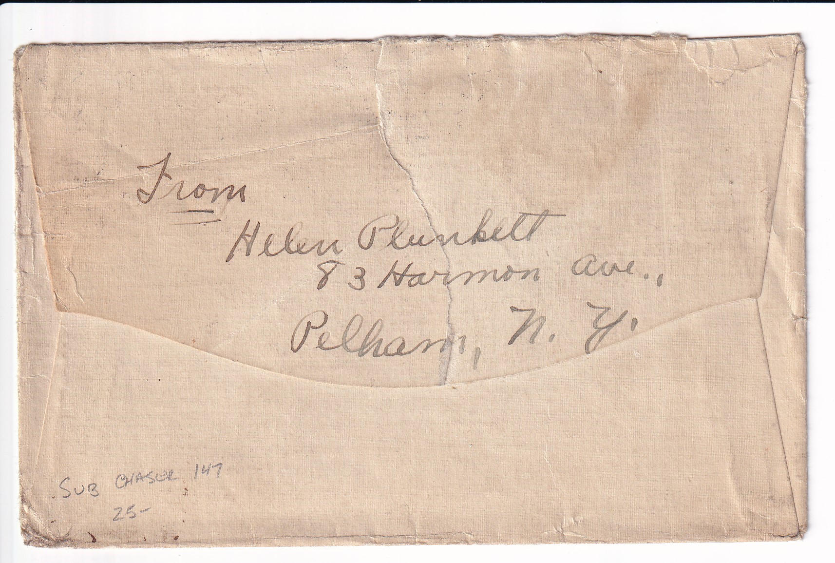 1918 Pelham, NY to Sub Chaser #147,, Charleston, SC.