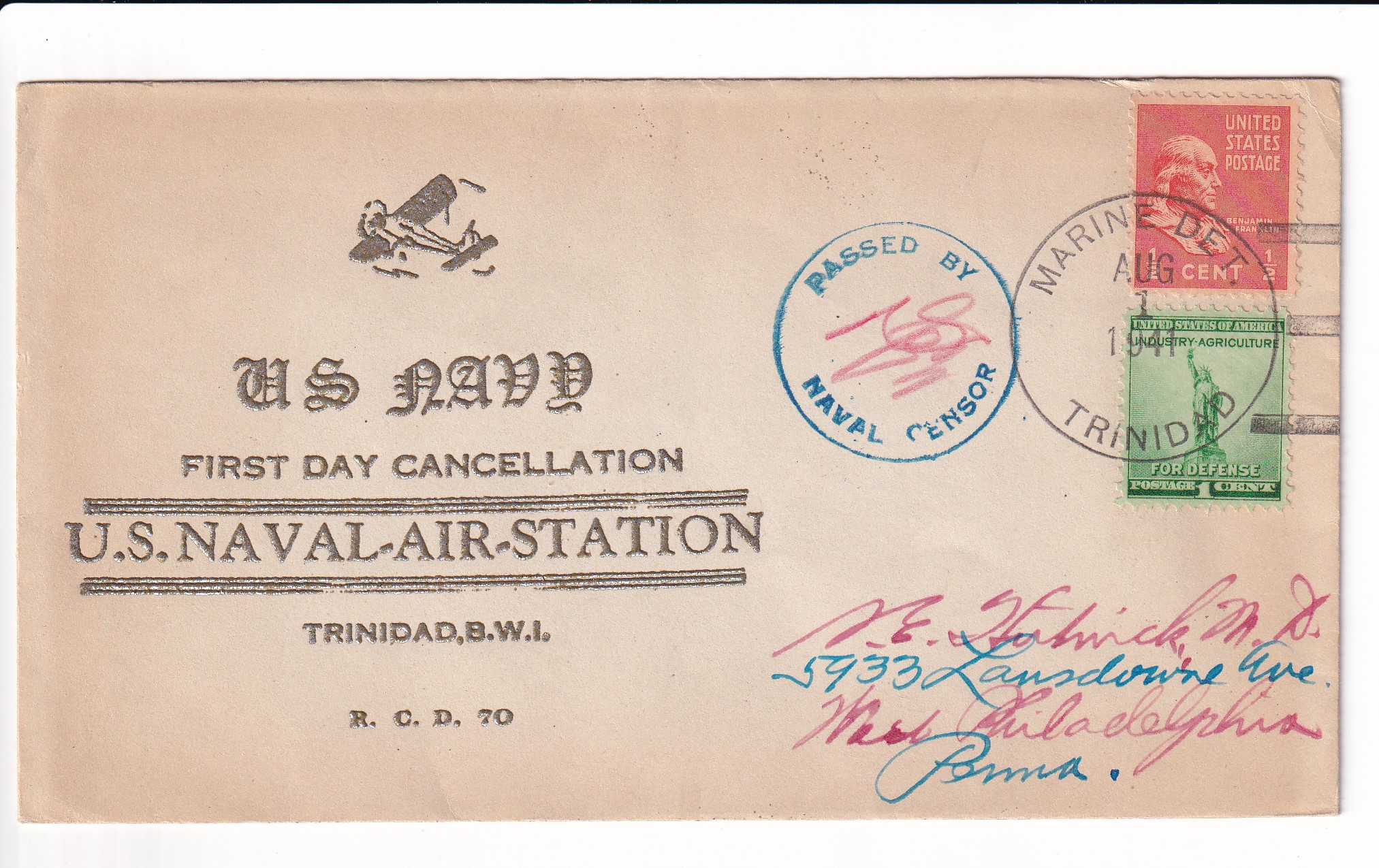 1941 1st Day Cancellation Marine Detachment, Trinidad to Philadelphia, Pa.