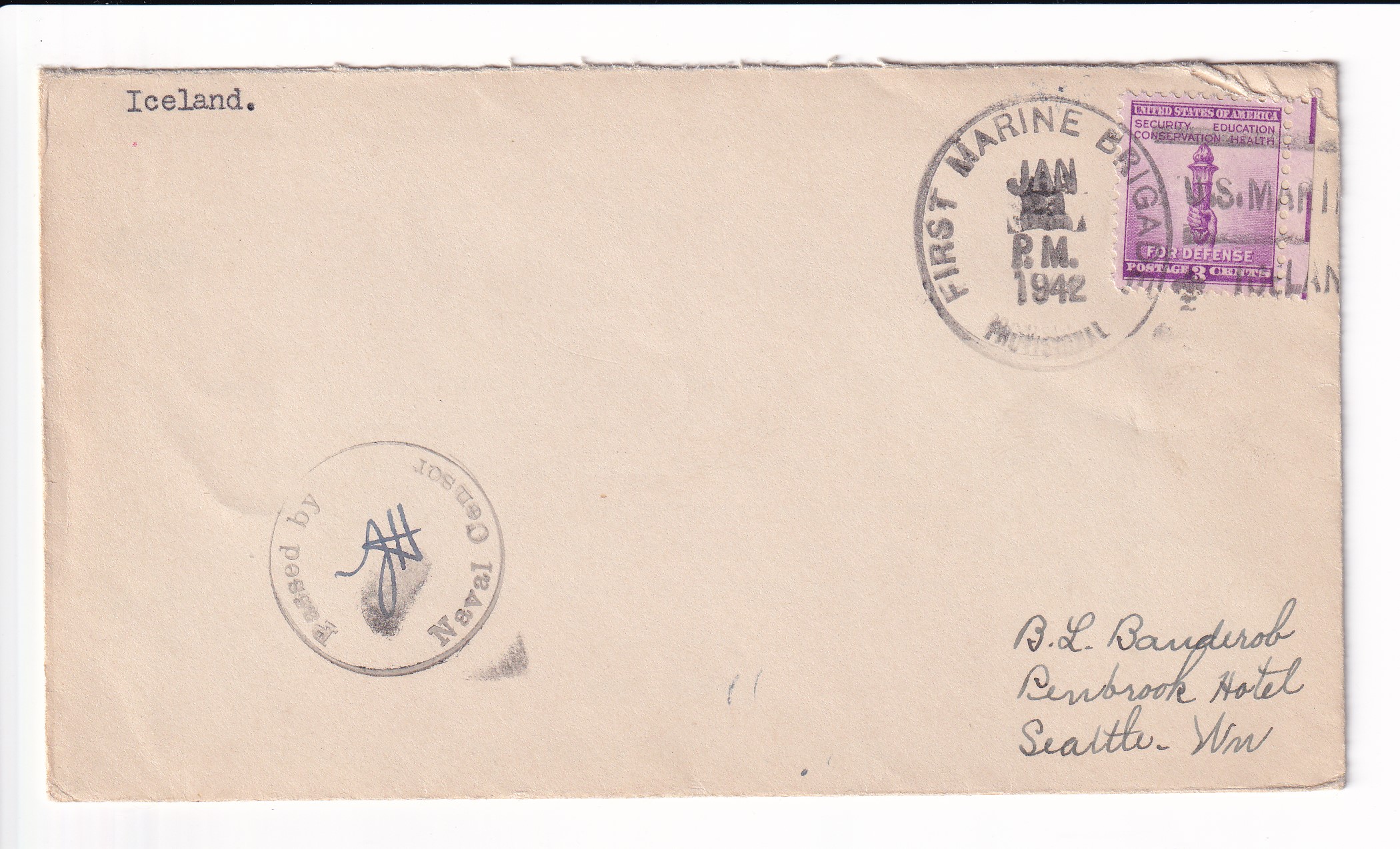 1941 1st Marine Provisional, Iceland to San Diego, Ca "No stamps available".