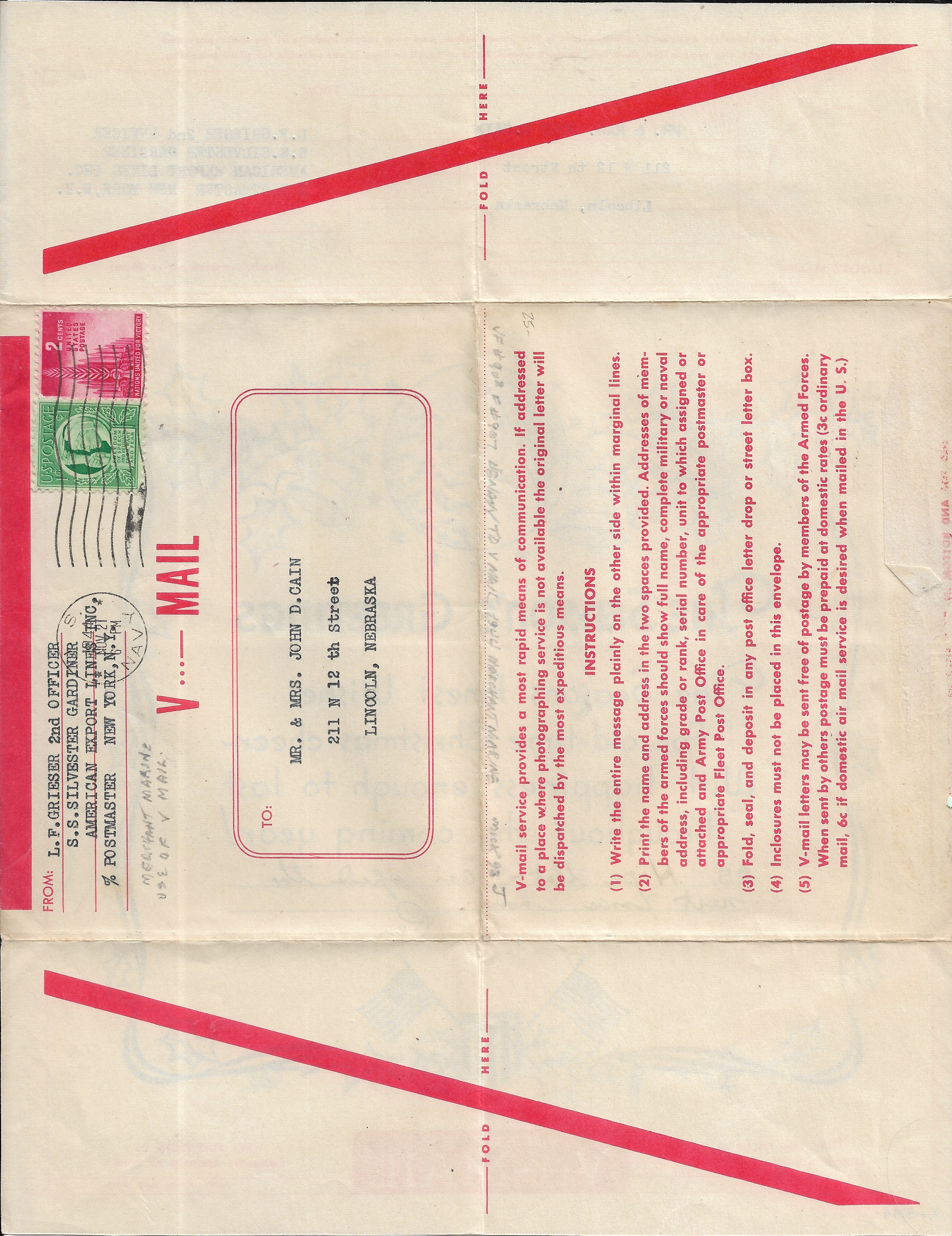 1944 S.S. Silvester Gardiner, FPO New York to Lincoln, Ne.