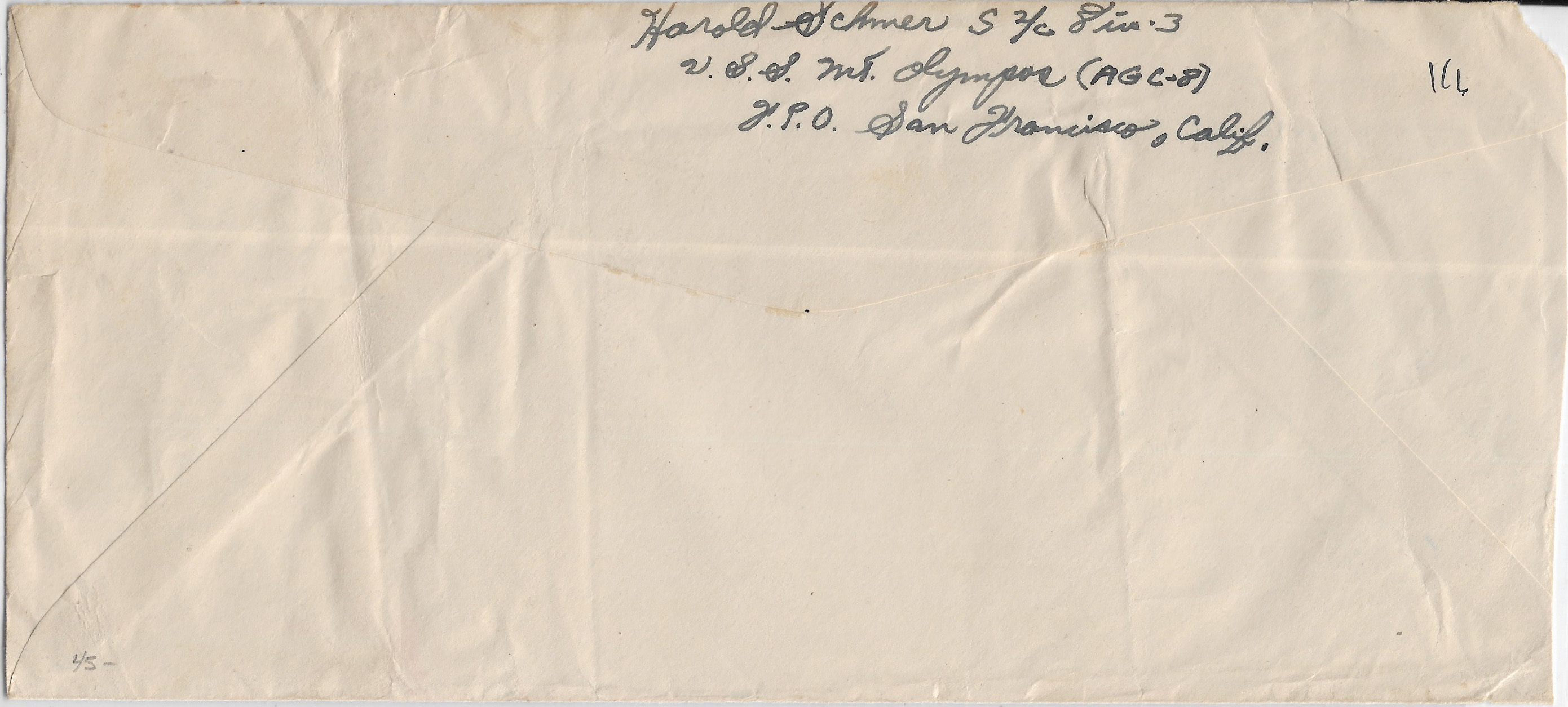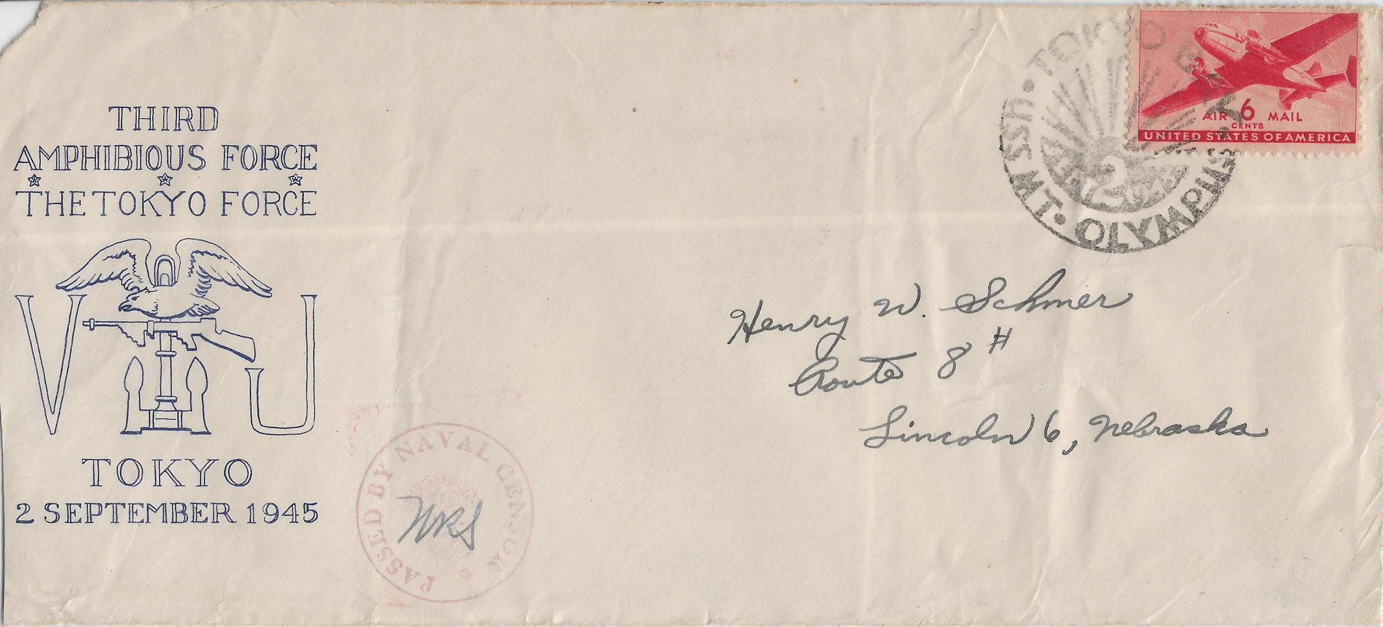 1945 USS Mt Olympus, Tokyo Bay to Lincoln, Ne Airmail Censored.