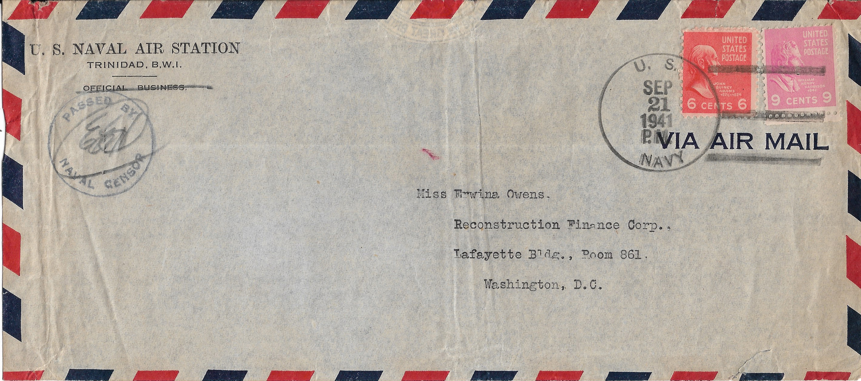 1941 NAS Trinidad to Washington DC Airmail 6c & 9c Prexie. #10.