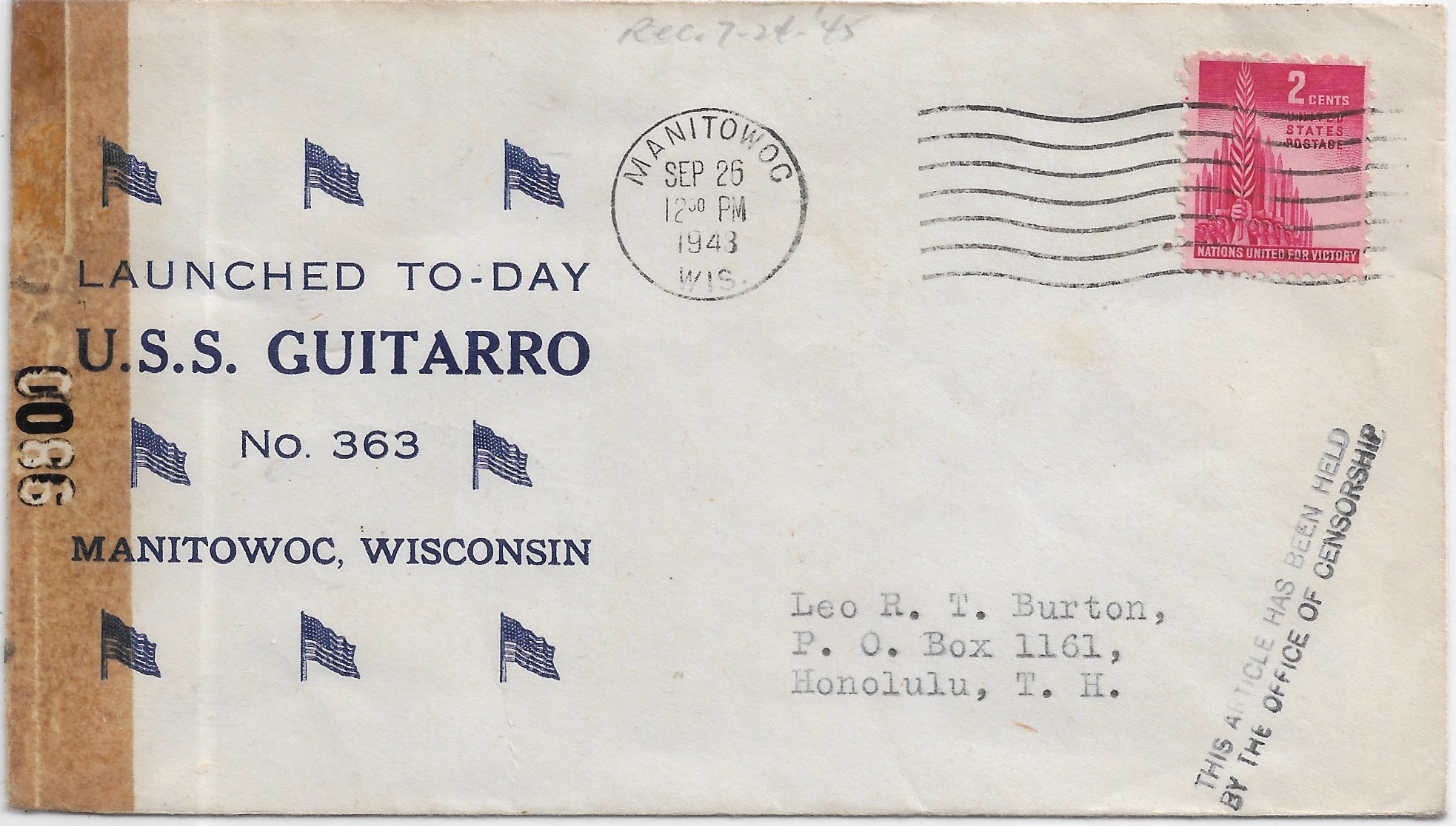 1943 USS Guitarro SS-363, Manitowoc, Wi to Honolulu, Hi "Held by Censorship Office".