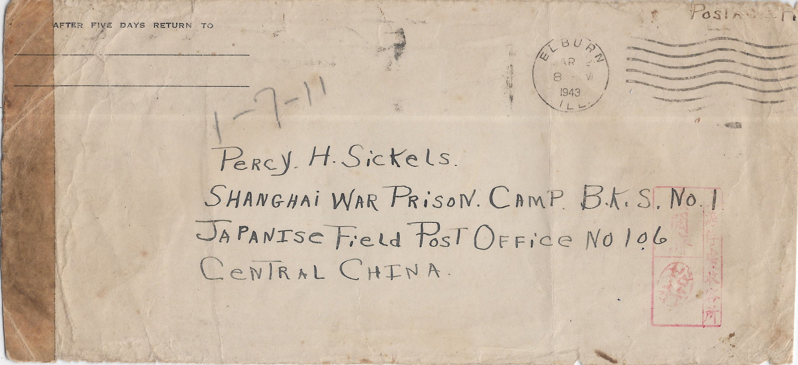 1943 Elburn, Il to USMC POW Shanghai War Camp #1, China, U.S. & Japanese Censors. Percy Sickels was a Private in the U.S. Marine Corp.